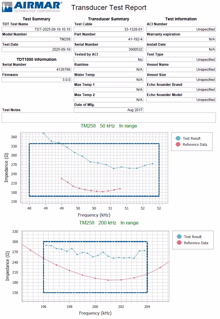 We tested it using a TDT1000, the gold standard in transducer testing, and it passed on both frequencies. Test report attached.
