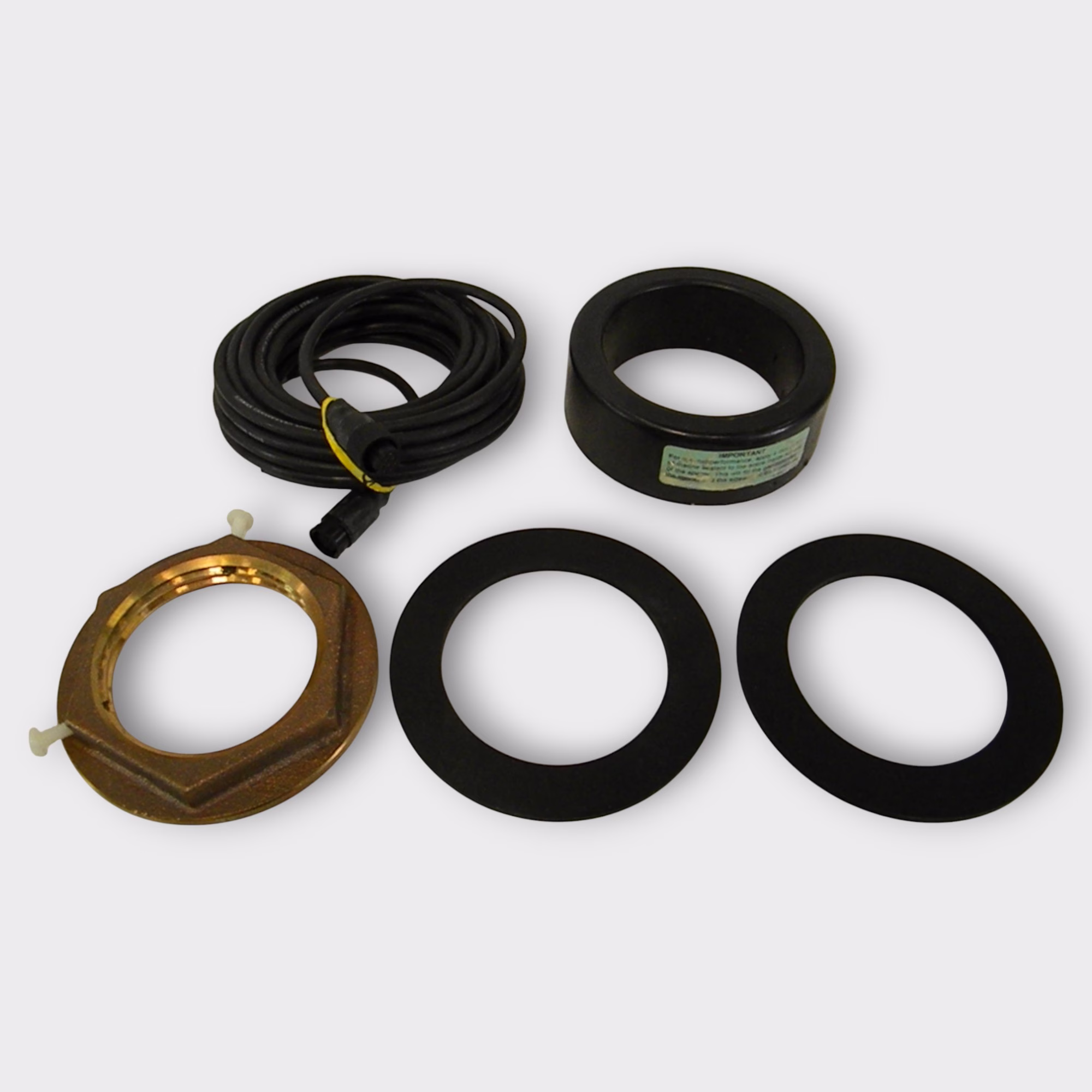 The transducer is a 1000w 12 degree tilted element 50/200khz transducer designed for installation on deadrises between 8 and 16 degrees. It comes complete with hull nut, plastic spacer, and 2x washers.