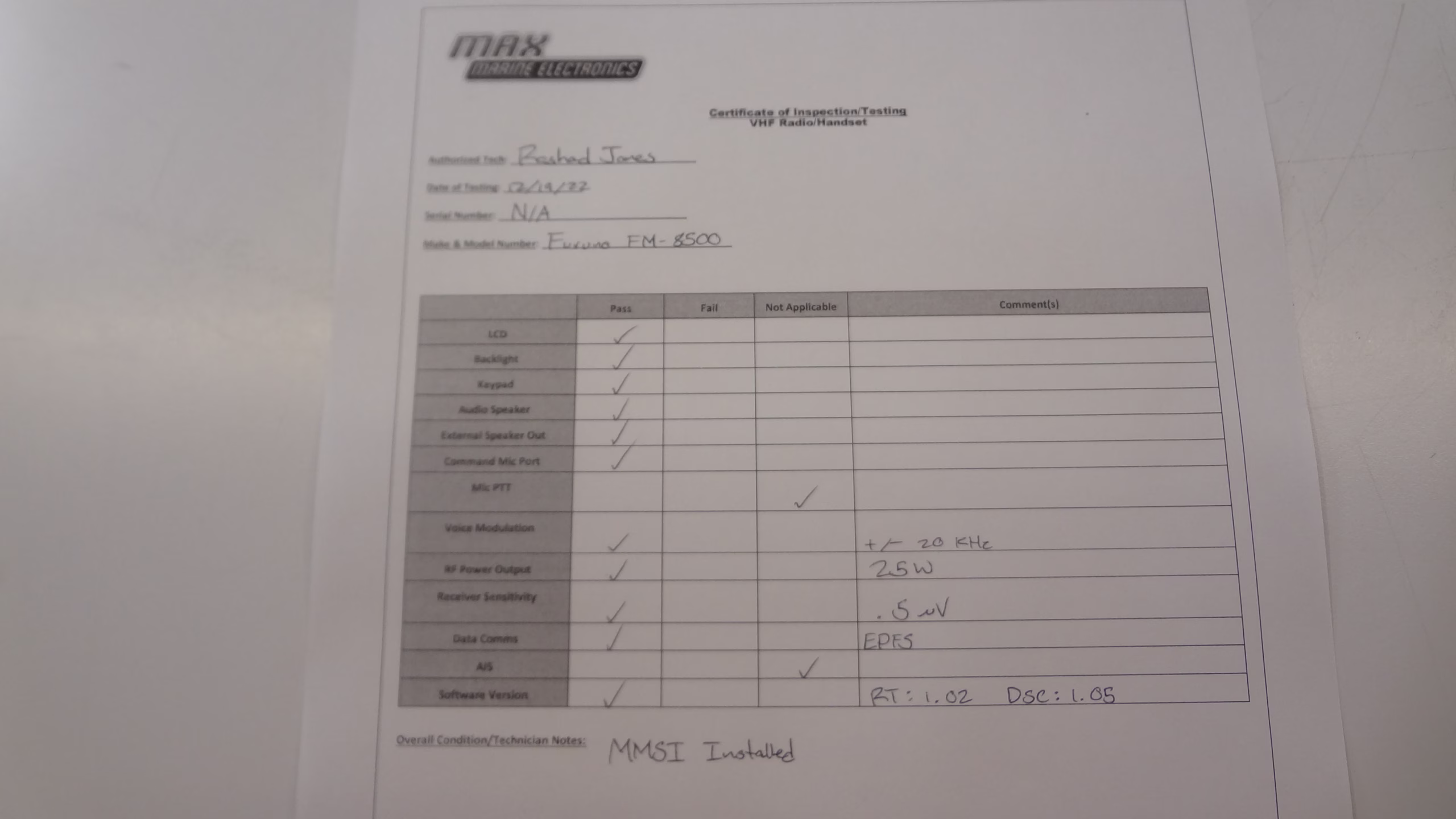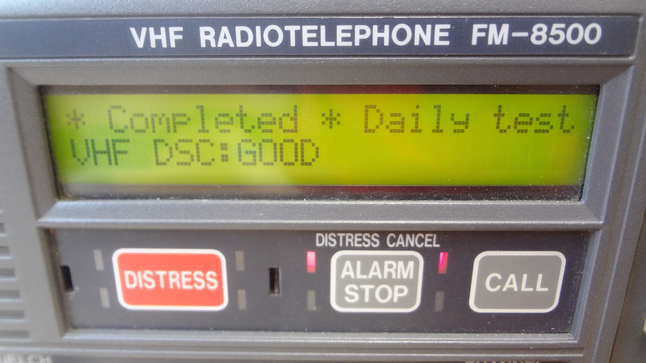 The VHF was tested for Rx / Tx, and WX using an IFR-1200s Communications Service Monitor.  The IFR-1200s is the industry standard for testing Marine and Aviation VHF radios.