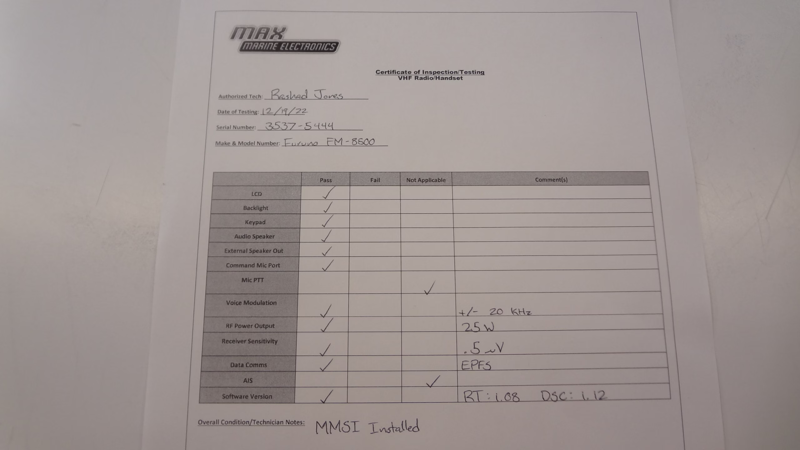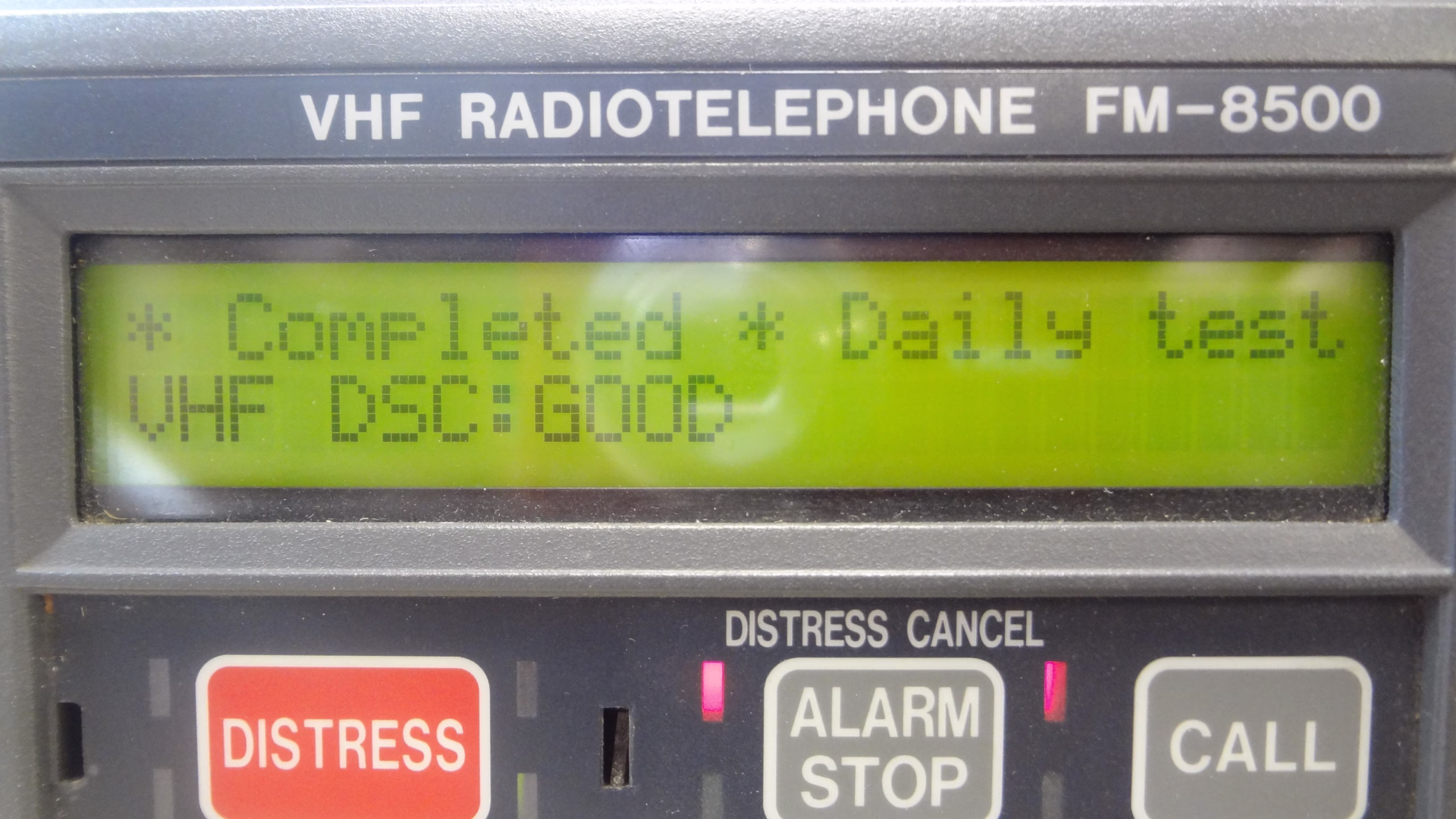 The VHF was tested for Rx / Tx, and WX using an IFR-1200s Communications Service Monitor. The IFR-1200s is the industry standard for testing Marine and Aviation VHF radios.