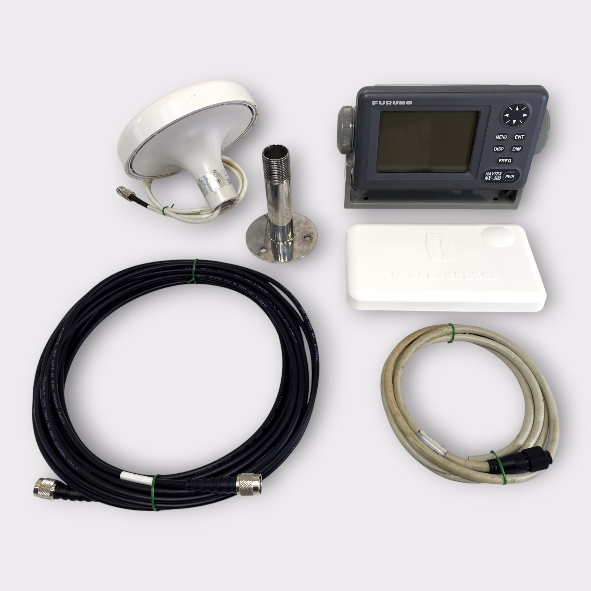 This NX-300 system was bench-tested and verified to be fully functional, with testing conducted to verify message receiving and NMEA 0183 communication. The display and antenna are in good overall condition, showing a few minor signs of wear/usage. *PLEASE NOTE: The antenna’s lettering decals are faded, and it has a blemish on its edge (please see photos) from wear/usage- this has no effect on its operation.*