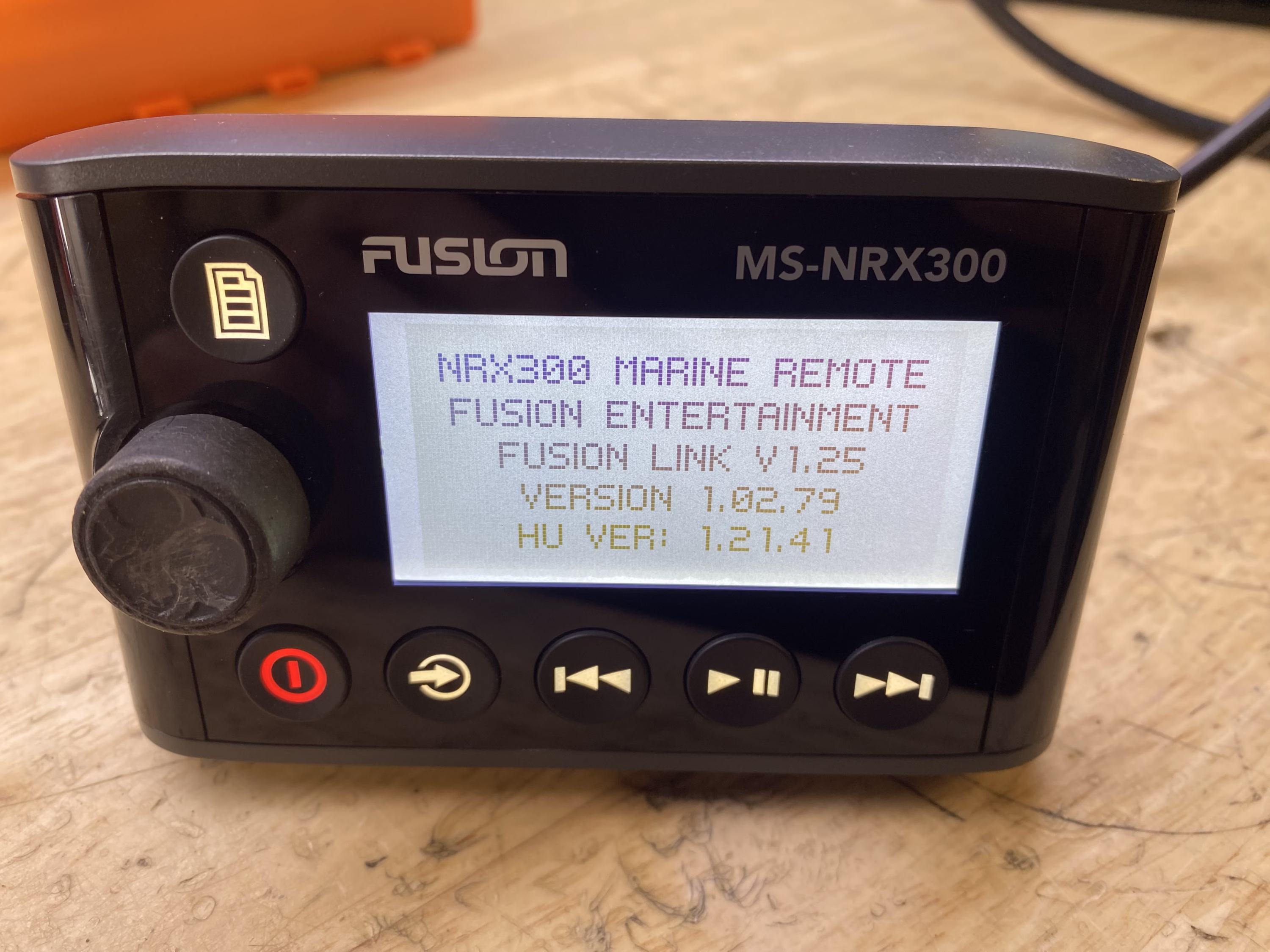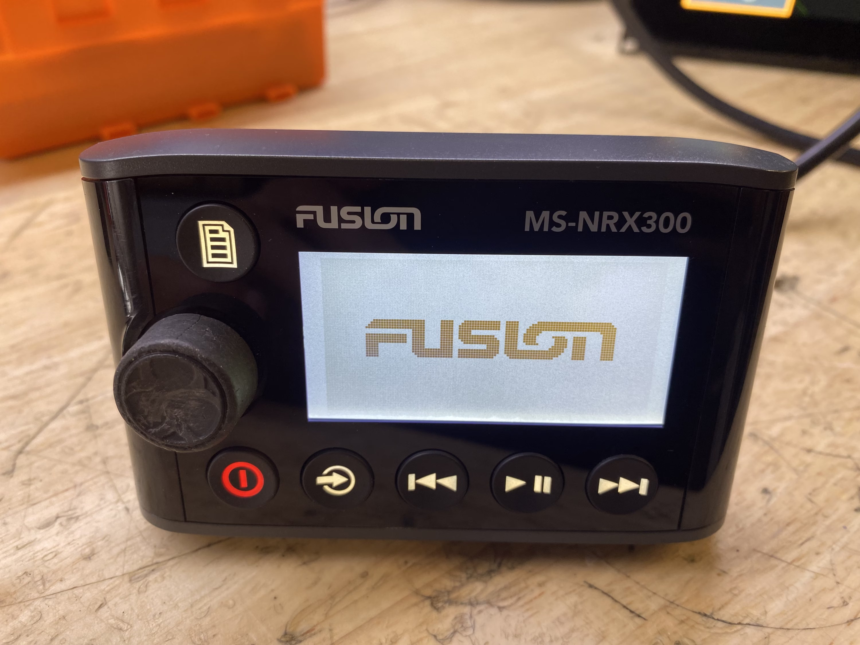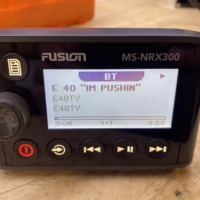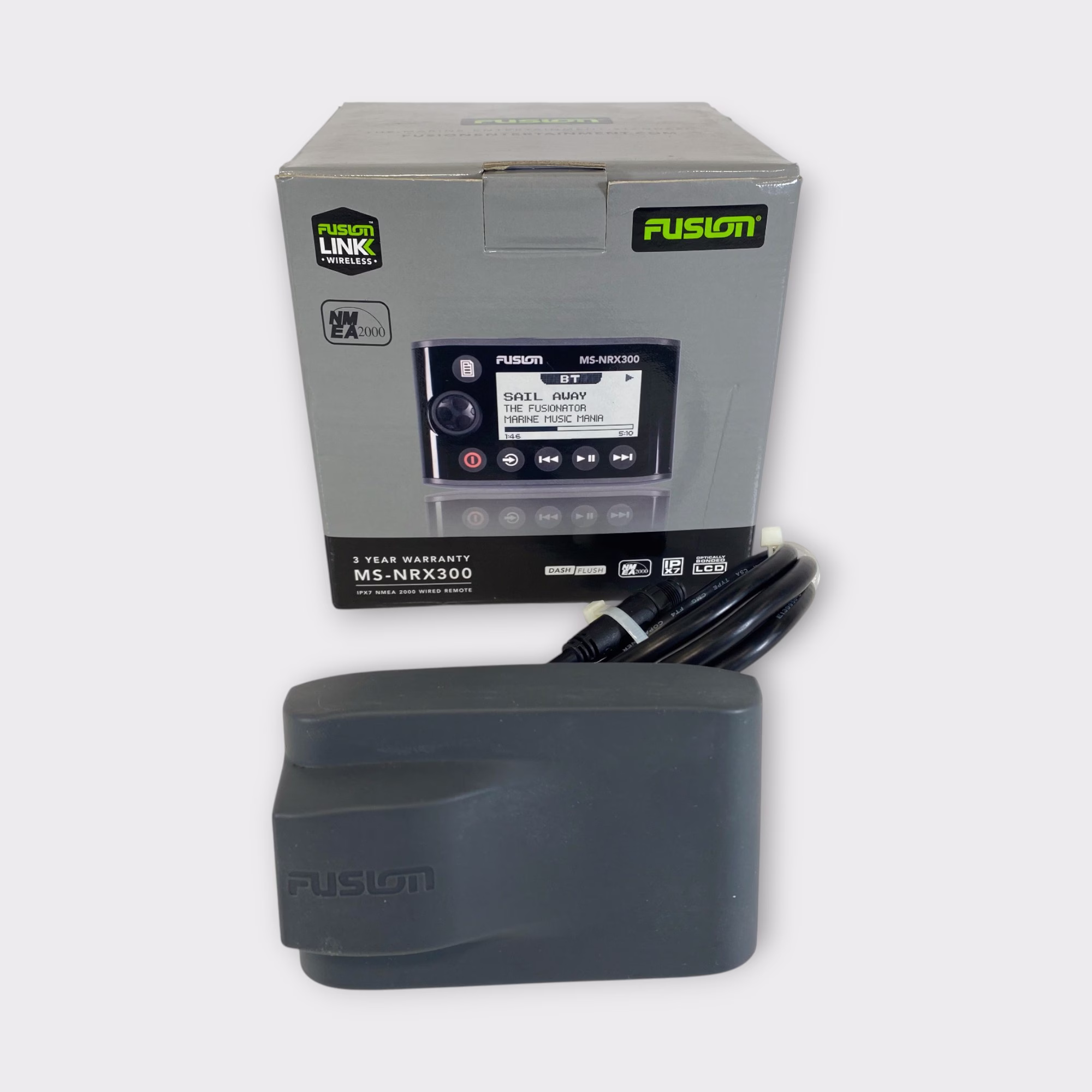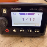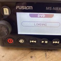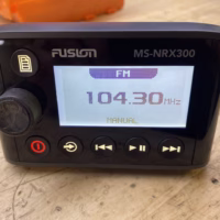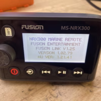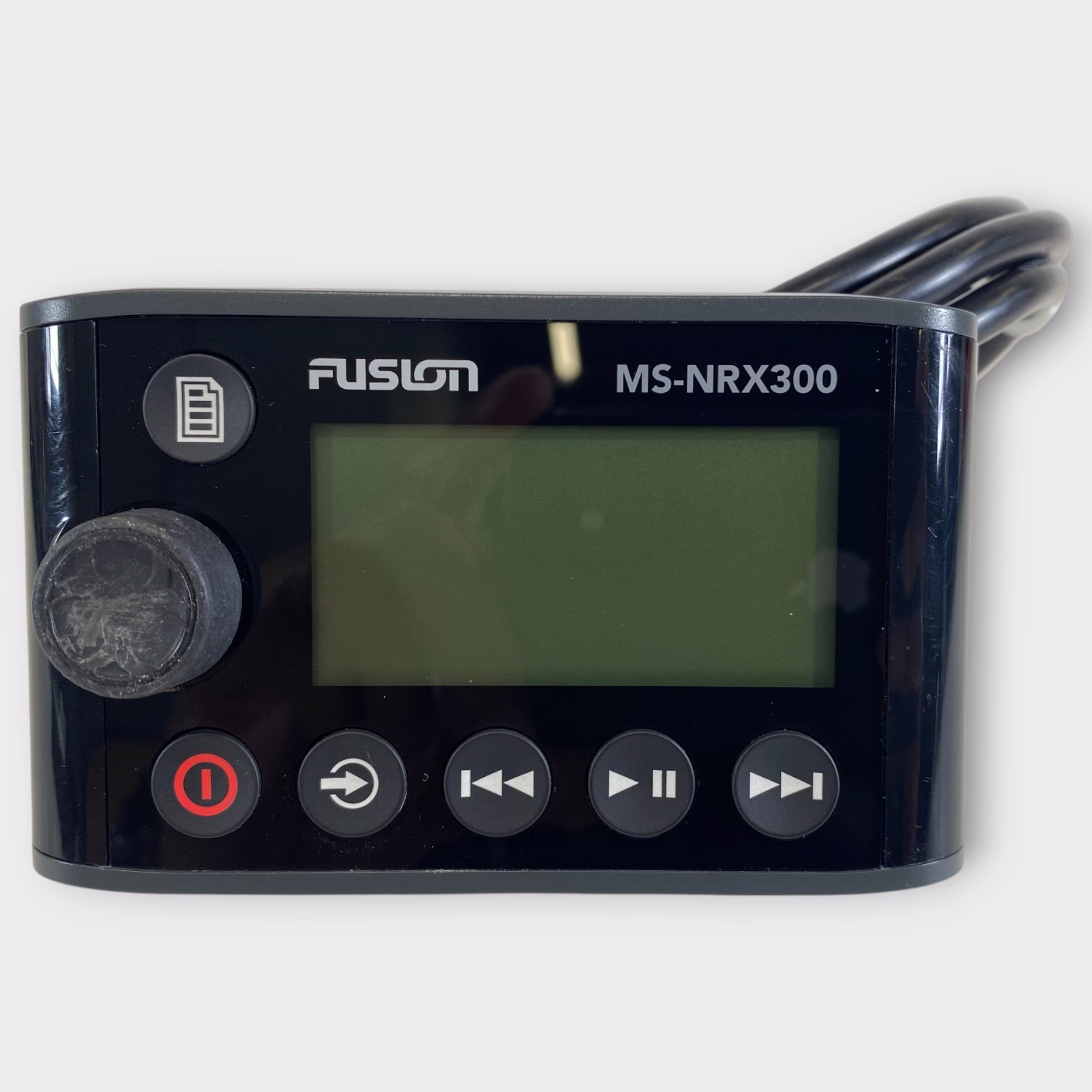 This listing is for a used Fusion MS-NRX300 Wired Marine Remote. The unit has been tested and is in good working condition. It shows some light cosmetic wear from previous use, but nothing that affects performance.