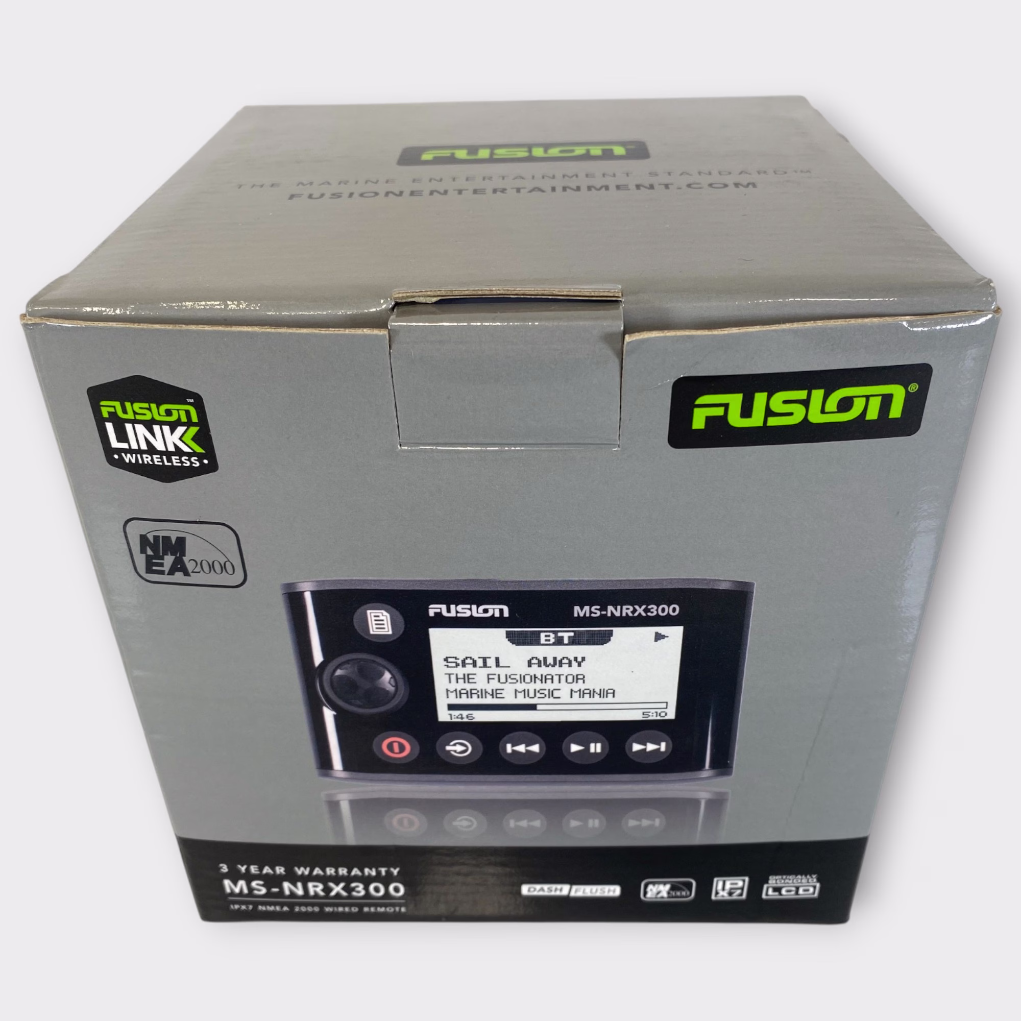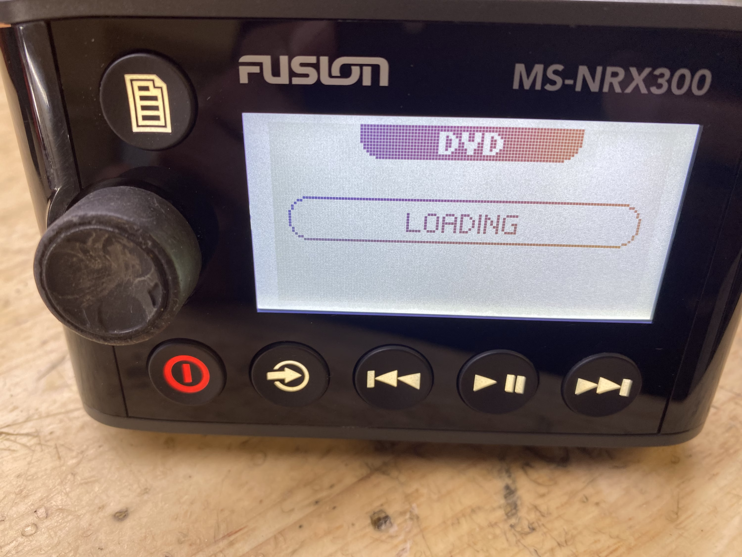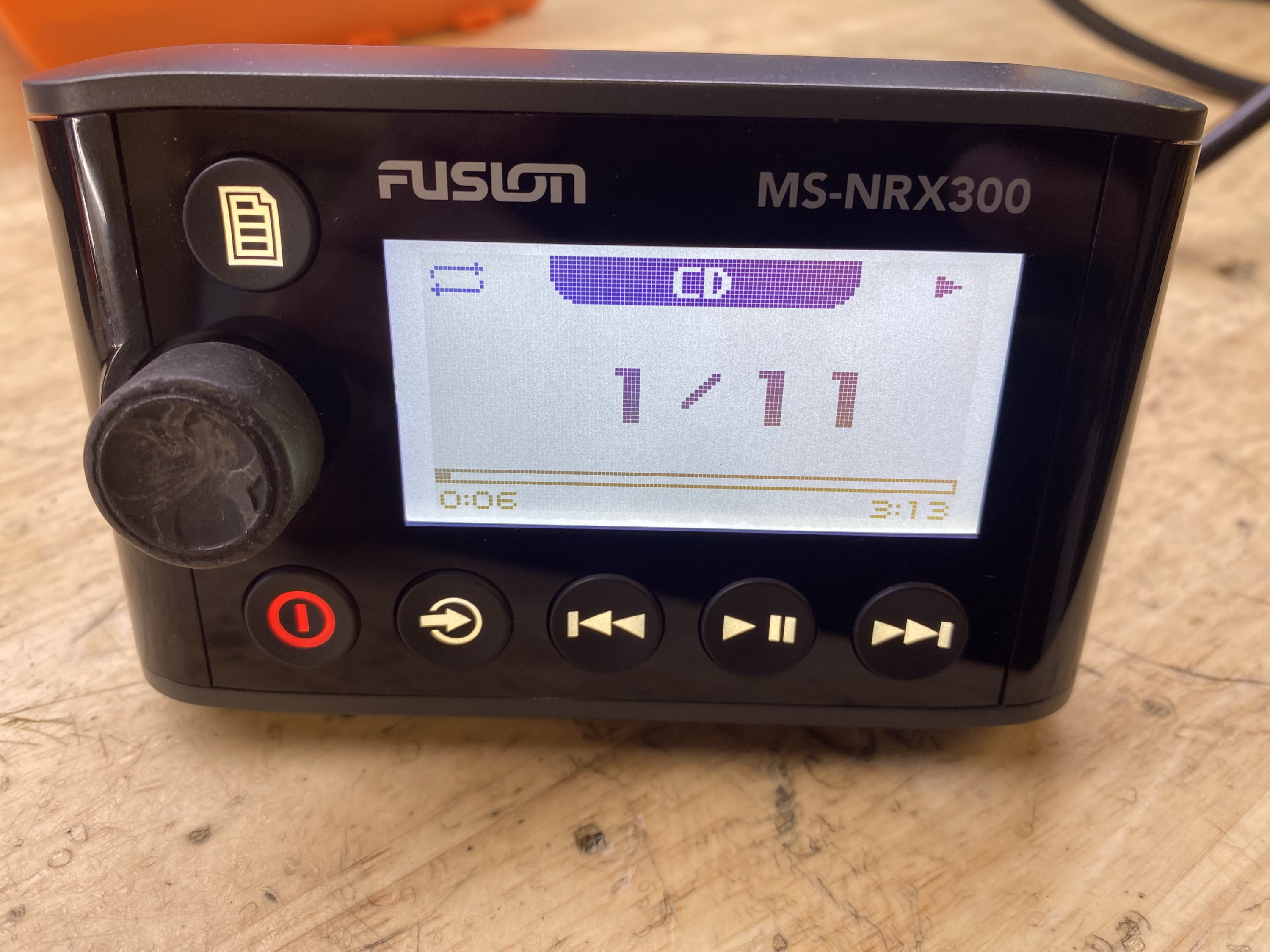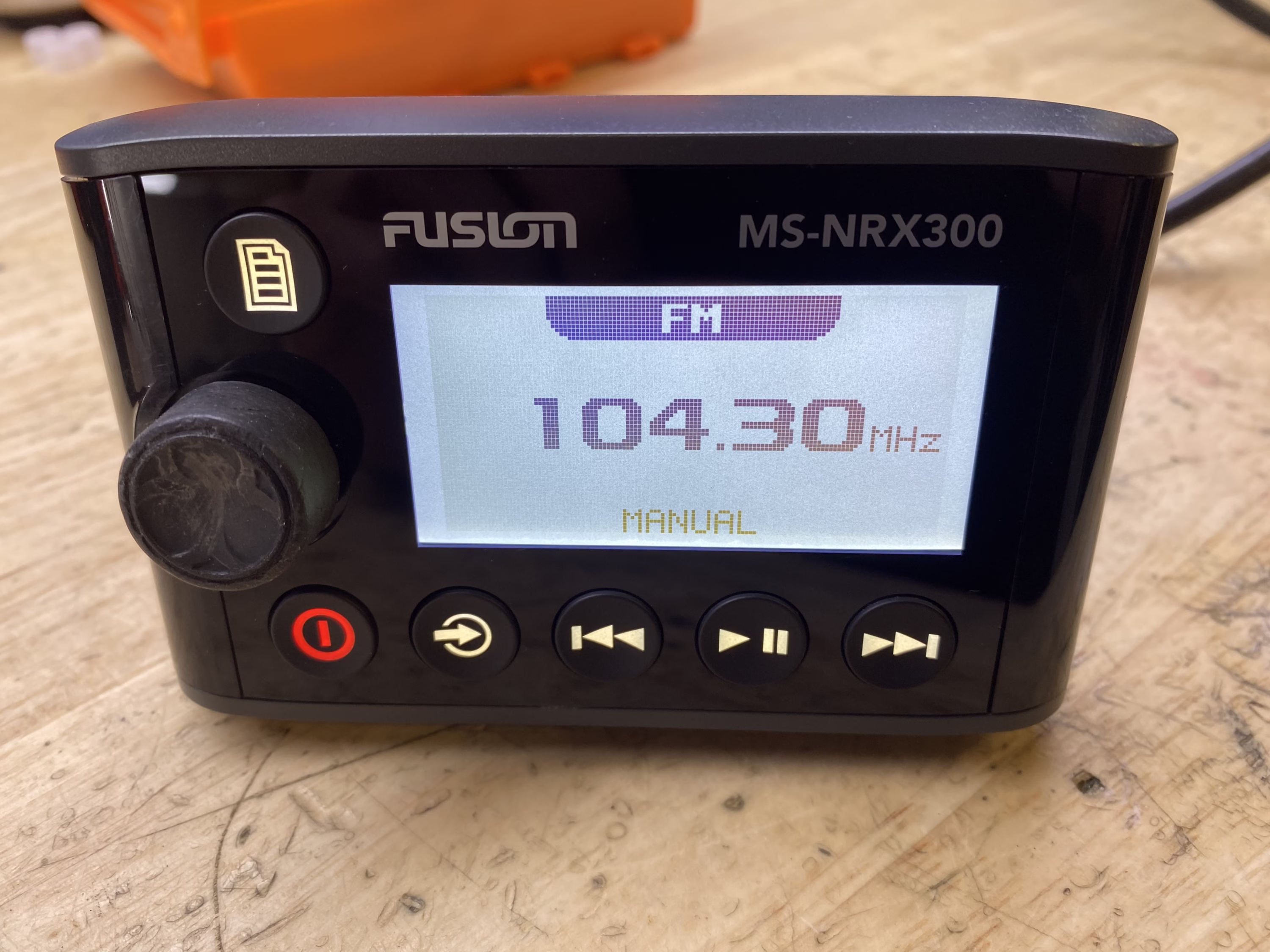This listing is for a used Fusion MS-NRX300 Wired Marine Remote. The unit has been tested and is in good working condition. It shows some light cosmetic wear from previous use, but nothing that affects performance.