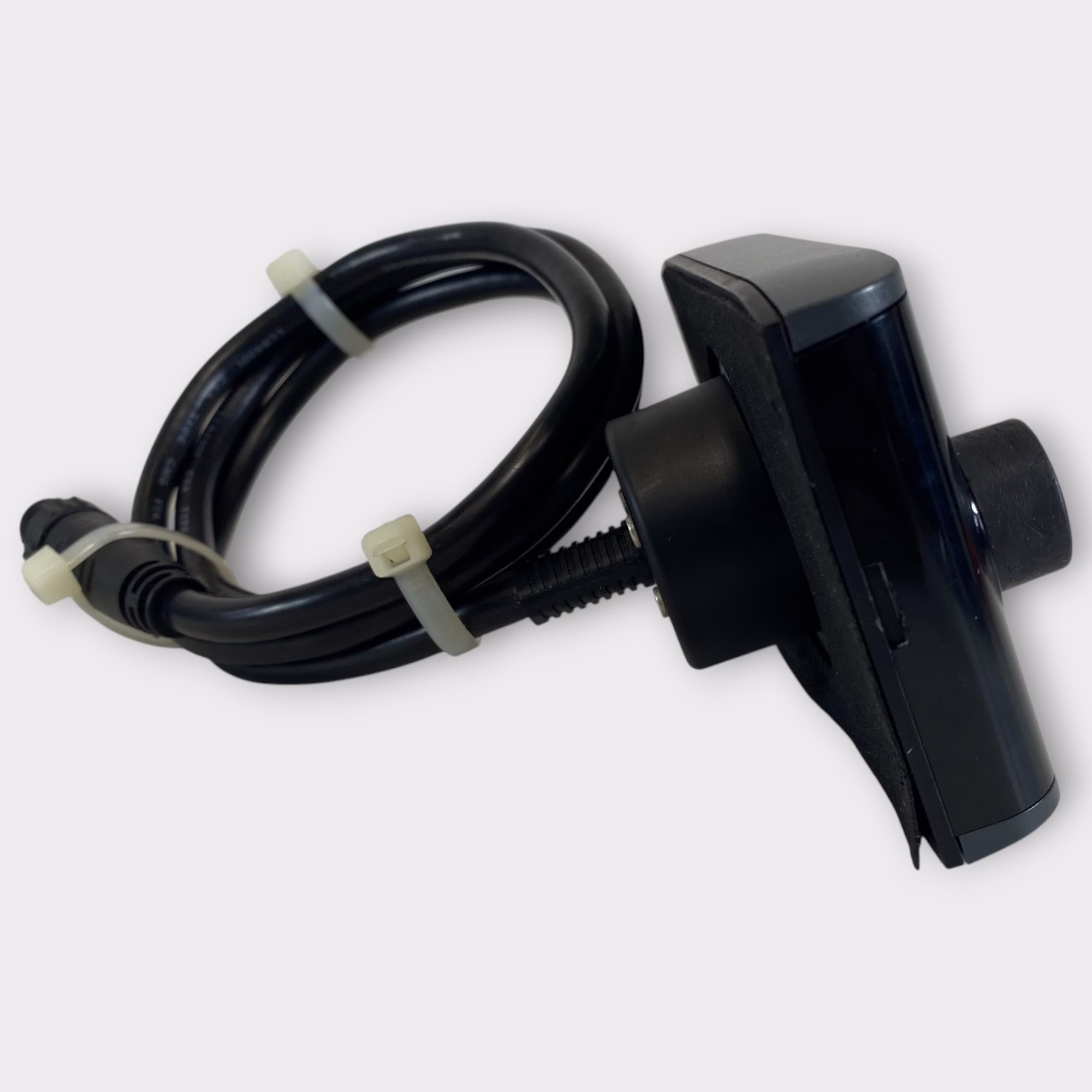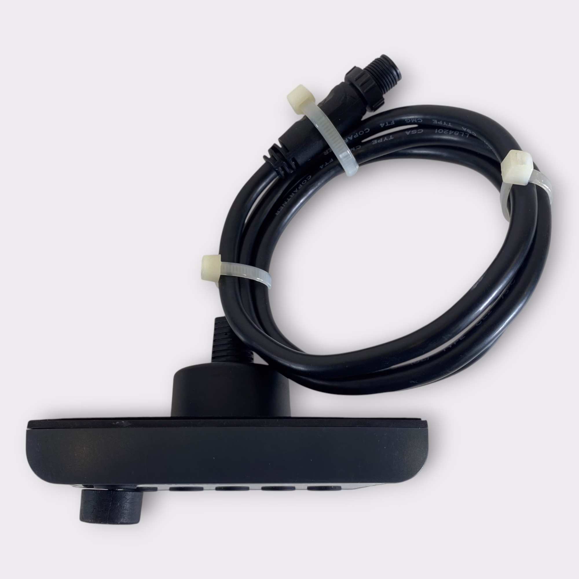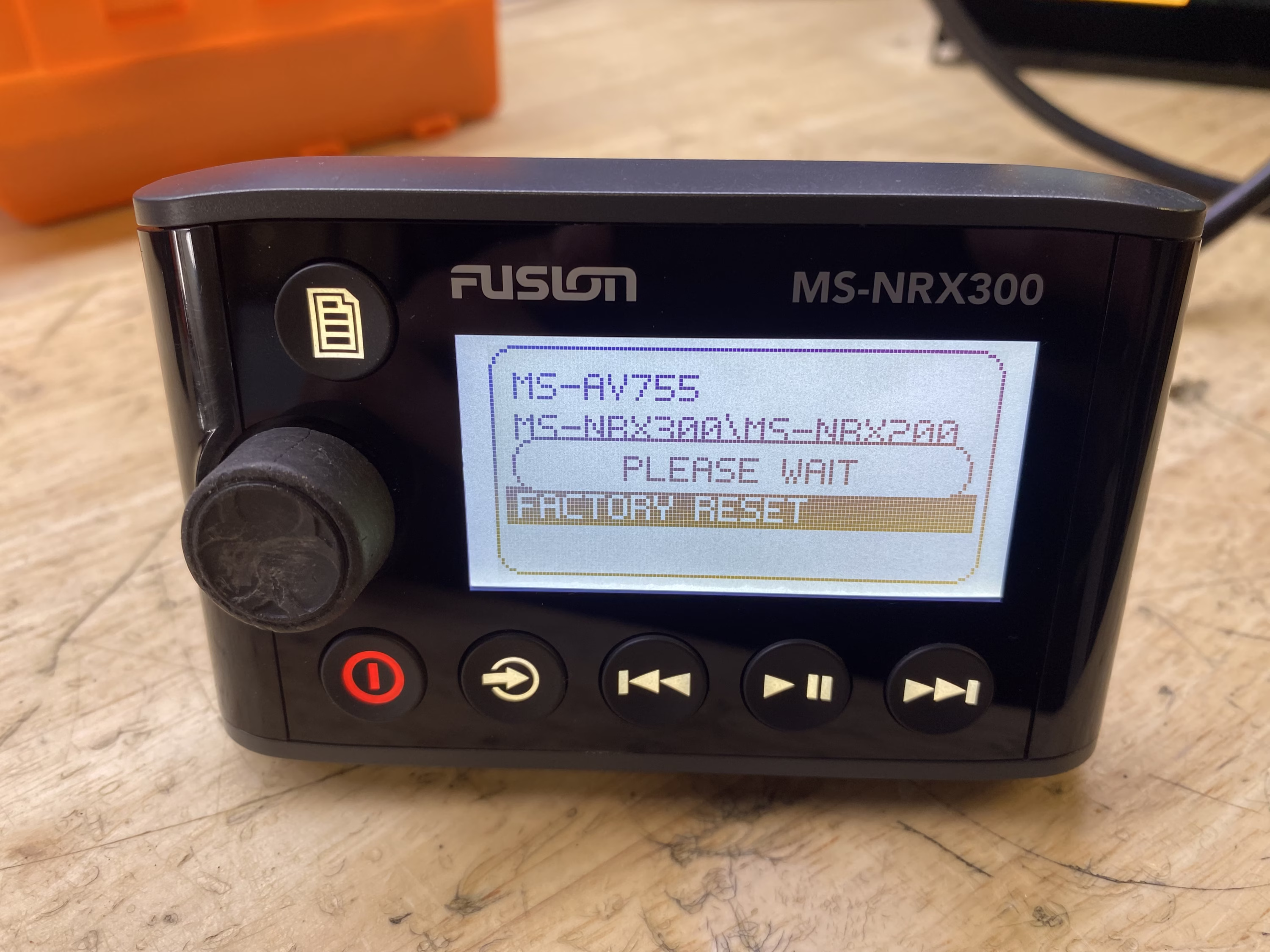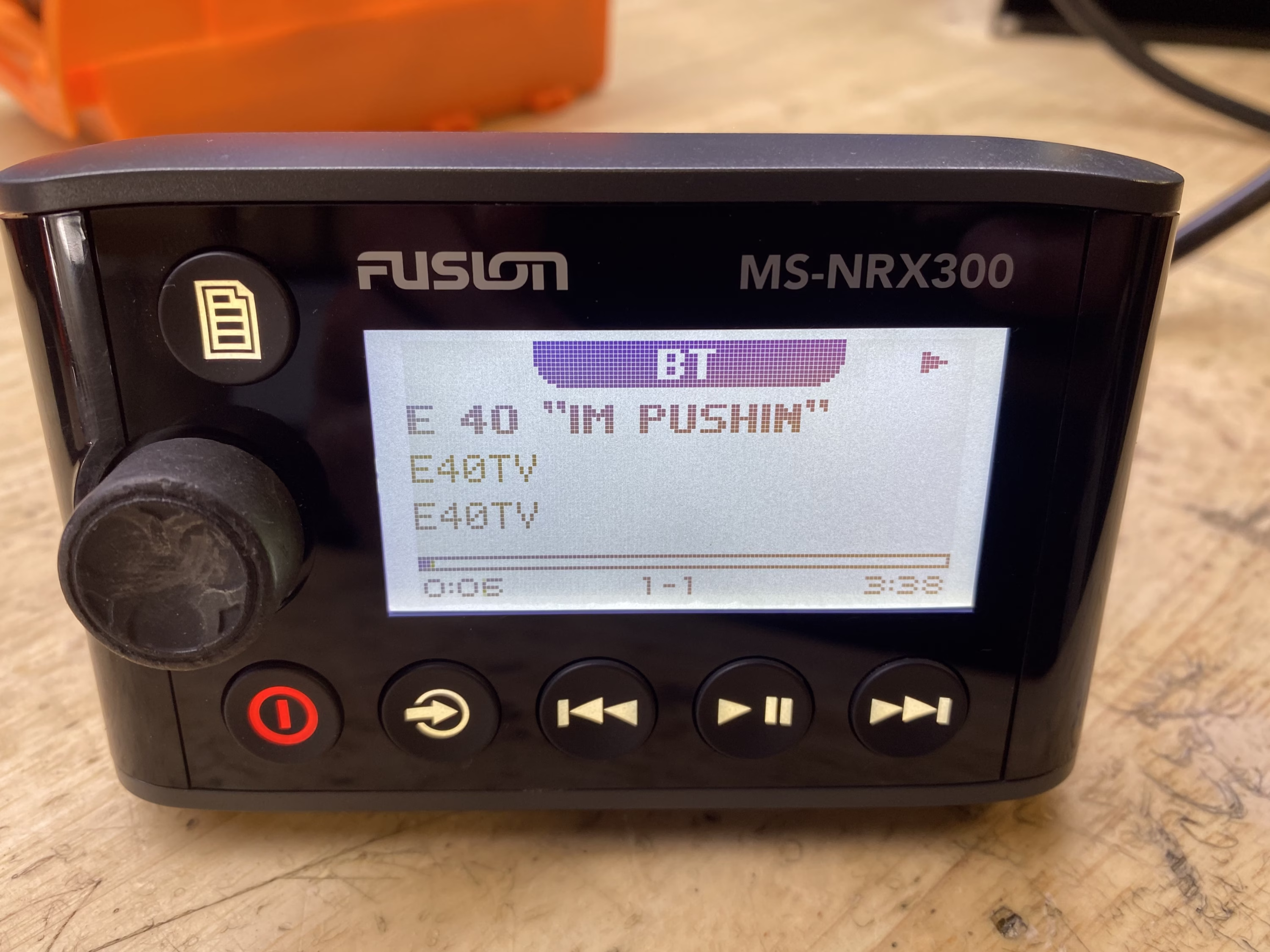 This listing is for a used Fusion MS-NRX300 Wired Marine Remote. The unit has been tested and is in good working condition. It shows some light cosmetic wear from previous use, but nothing that affects performance.