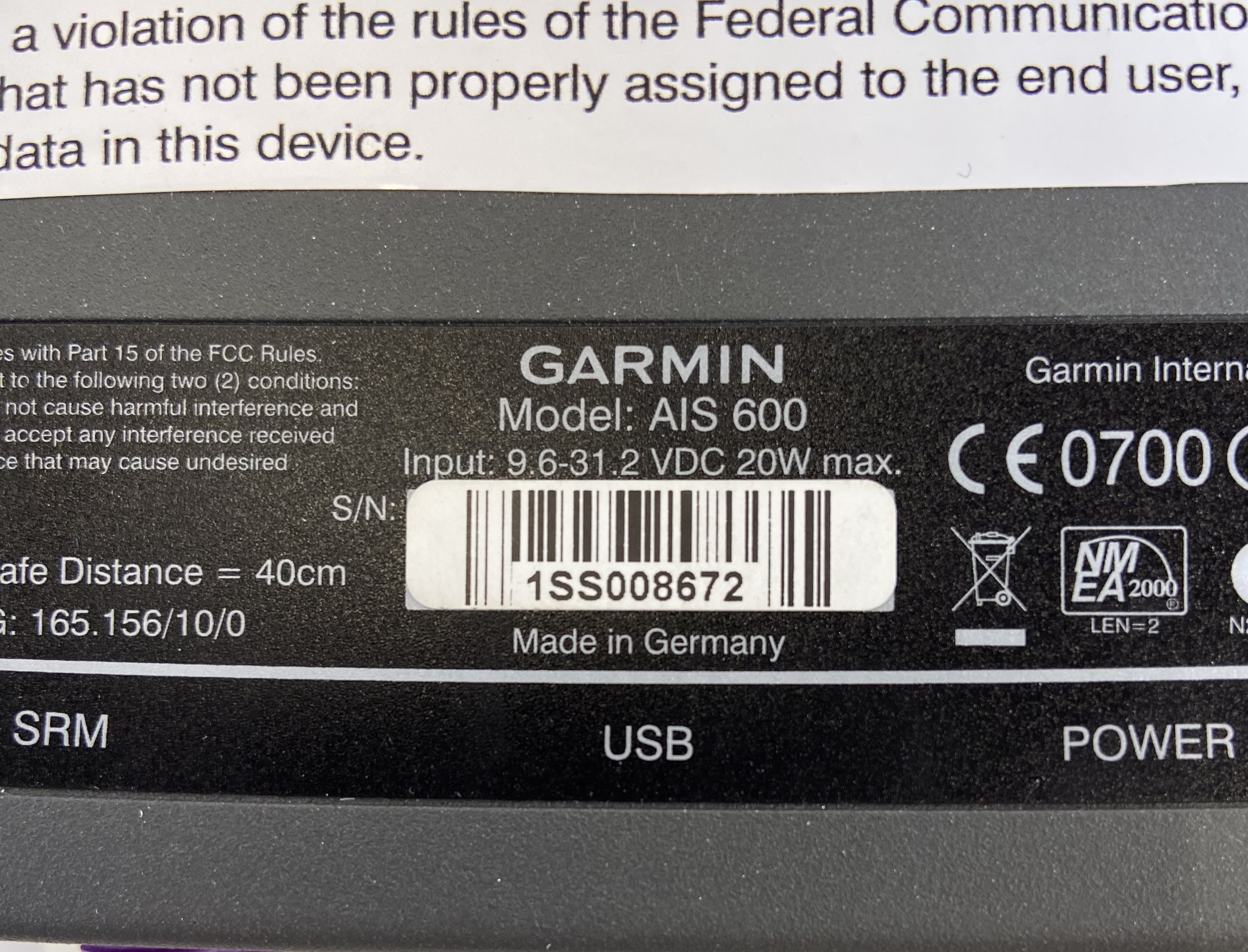 This listing is for a Garmin AIS600 Class B AIS Transponder that has been fully tested and confirmed operational.