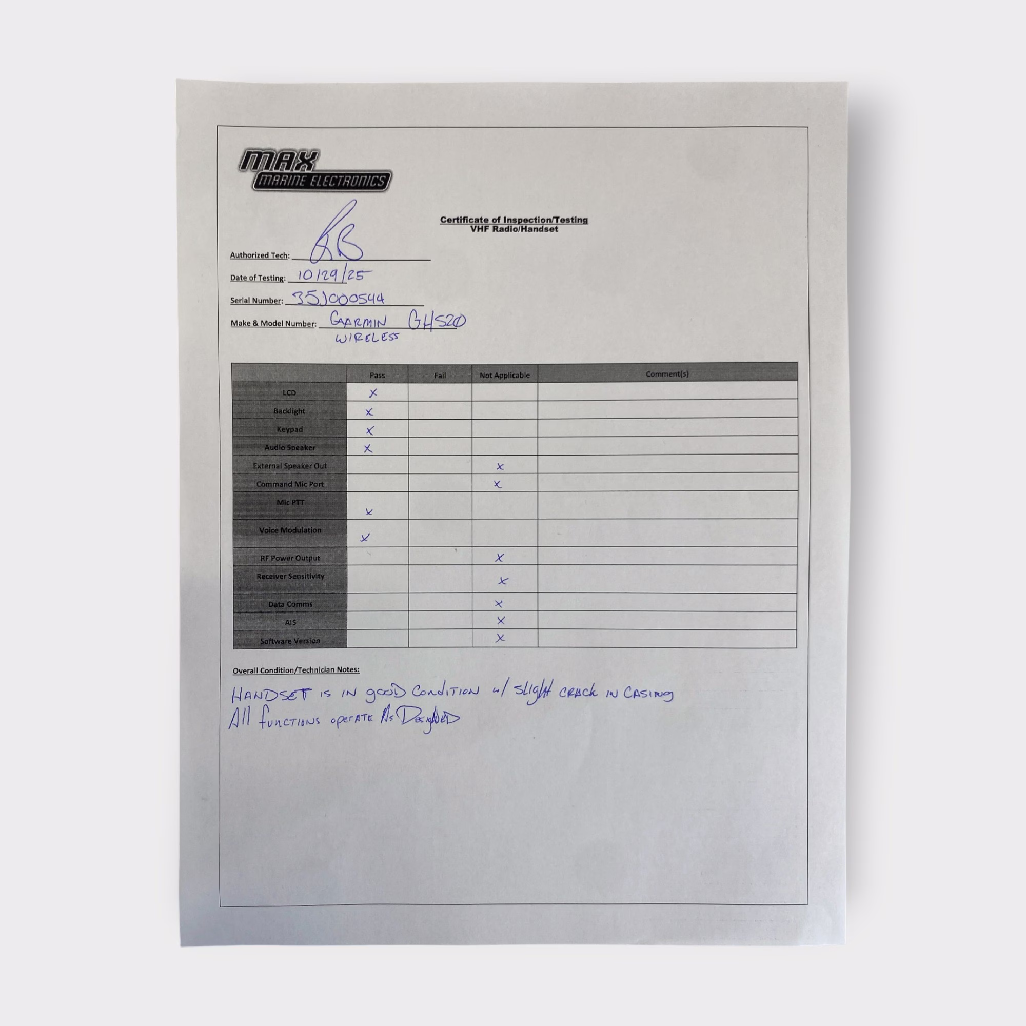 Additional Notes: This wireless handset was power tested at 12 volts and all functions (LCD, buttons, backlight, speaker) appeared to perform as they should.