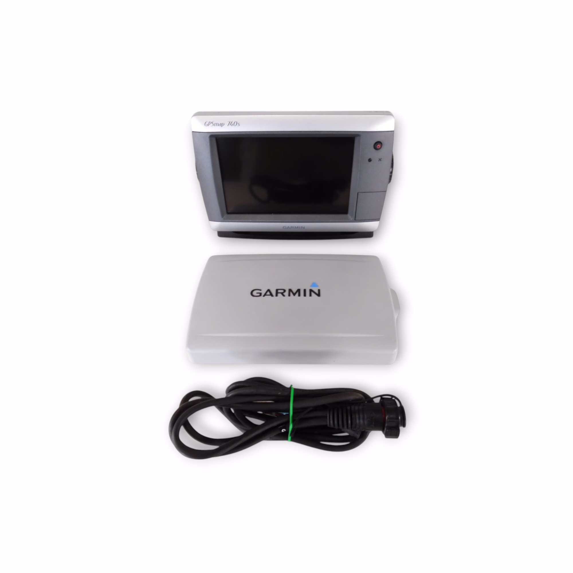 This Garmin GPSMAP 740s has been bench-tested and verified to be fully functional. We tested the chart card slot, sonar port (via the power cable), NMEA2000, and network port. The unit was also updated to the latest software version.