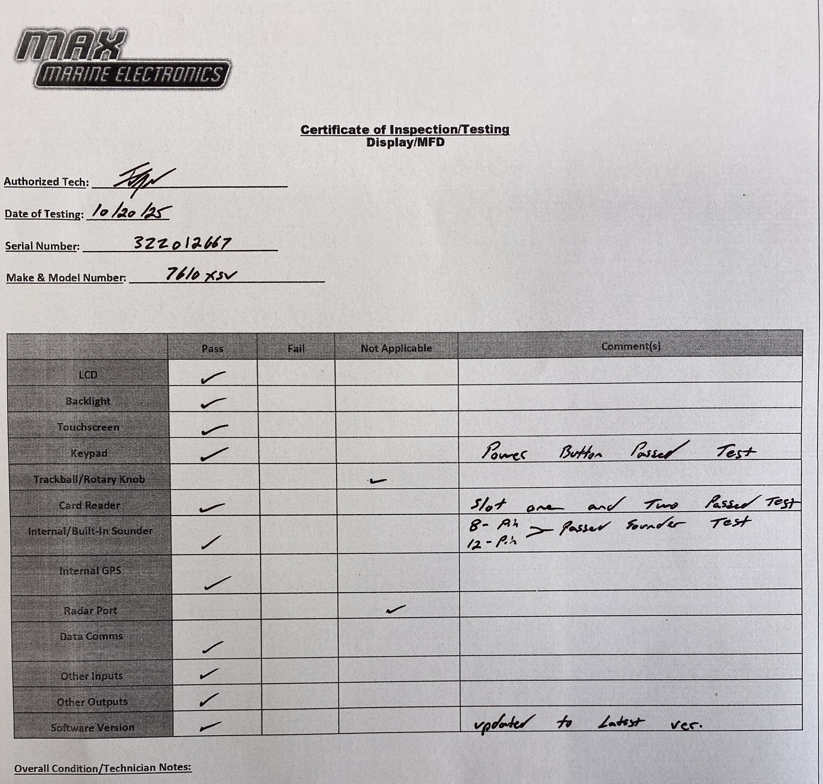 This listing is for a GPSmap 7610XSV MFD display. We confirmed working functionality of the NMEA2000 port, 8-pin and 12-pin transducer port, internal GPS, and both network and both video ports and card slot 1 and 2 is fully functional. Internal GPS is precises and responsive. Unit was updated to the latest software Garmin has to offer.