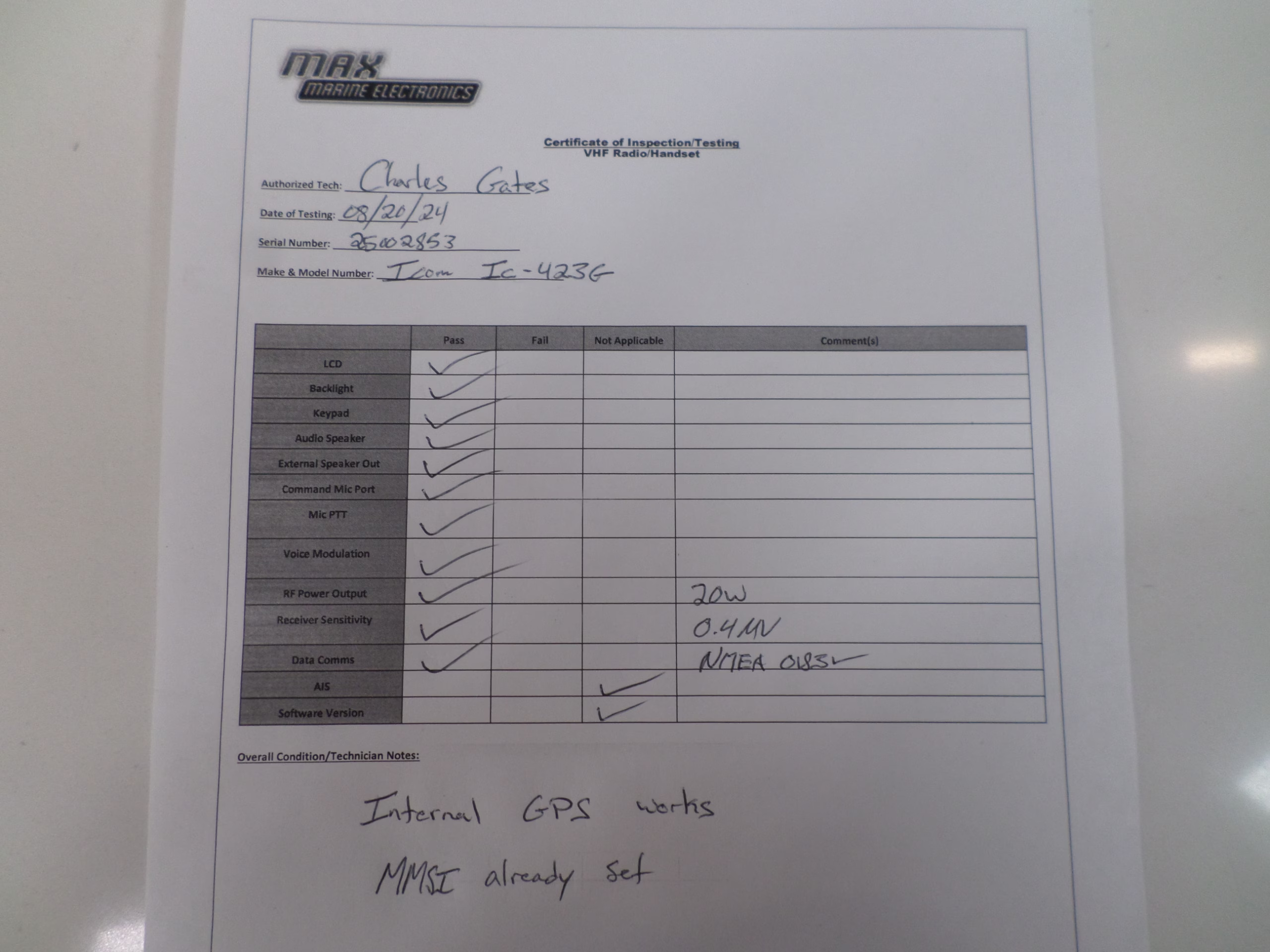 Additional Notes: This highly capable modern Marine VHF radio was successfully tested here at MME. Testing with our instruments revealed good transmitter power and receiver sensitivity. This model features NMEA 0183 connectivity and a built-in GPS.