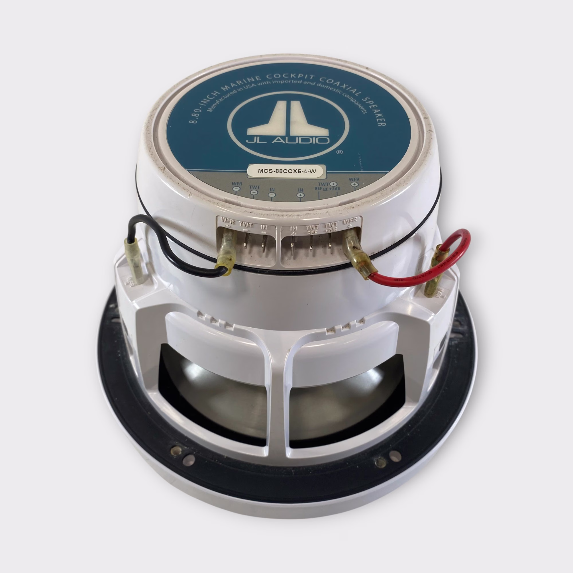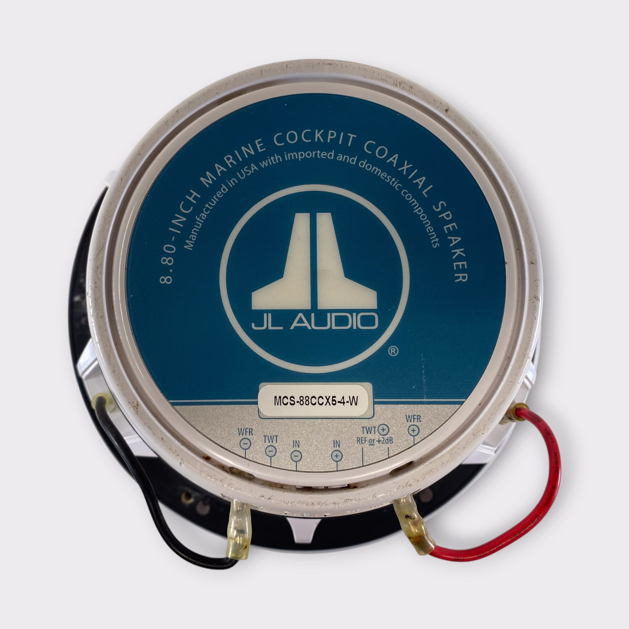 This is a used JL Audio MCS-88CCX-4-W 8.8″ Marine Speaker in white. This high-performance marine-grade speaker delivers powerful, clear sound and is built to withstand harsh marine environments. It’s part of JL Audio’s premium M-Series lineup, known for outstanding durability and sound quality on the water.