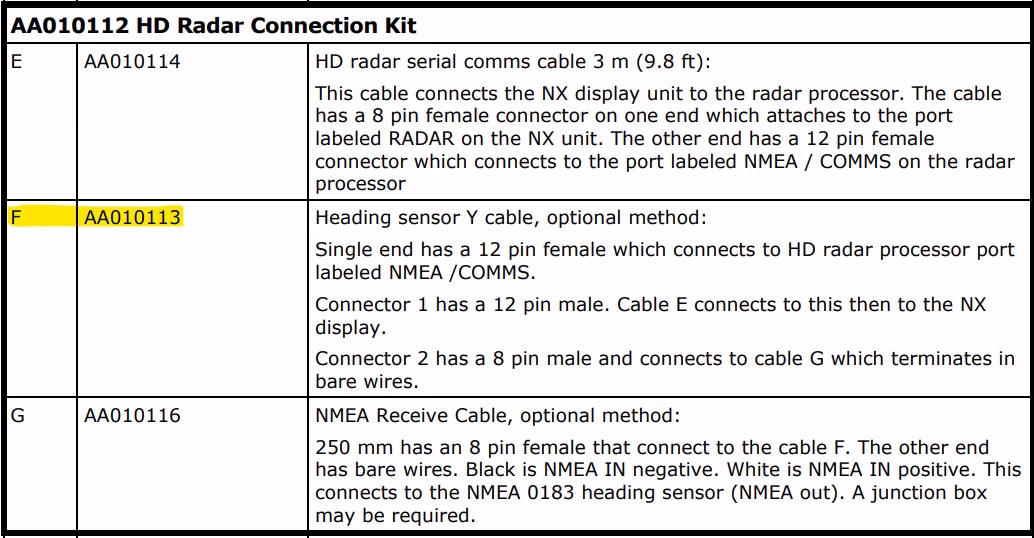 This Y-cable will require other cables (AA010114 for Y-cable to Display and AA010116 for Y-Cable to Heading Source). We’ve included a screenshot from the manual showing the cable we’re selling highlighted and showing the other cables needed.
