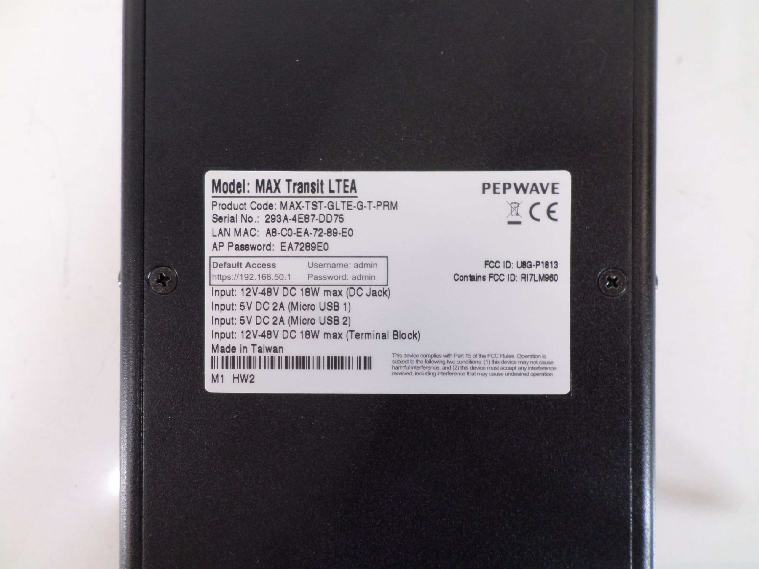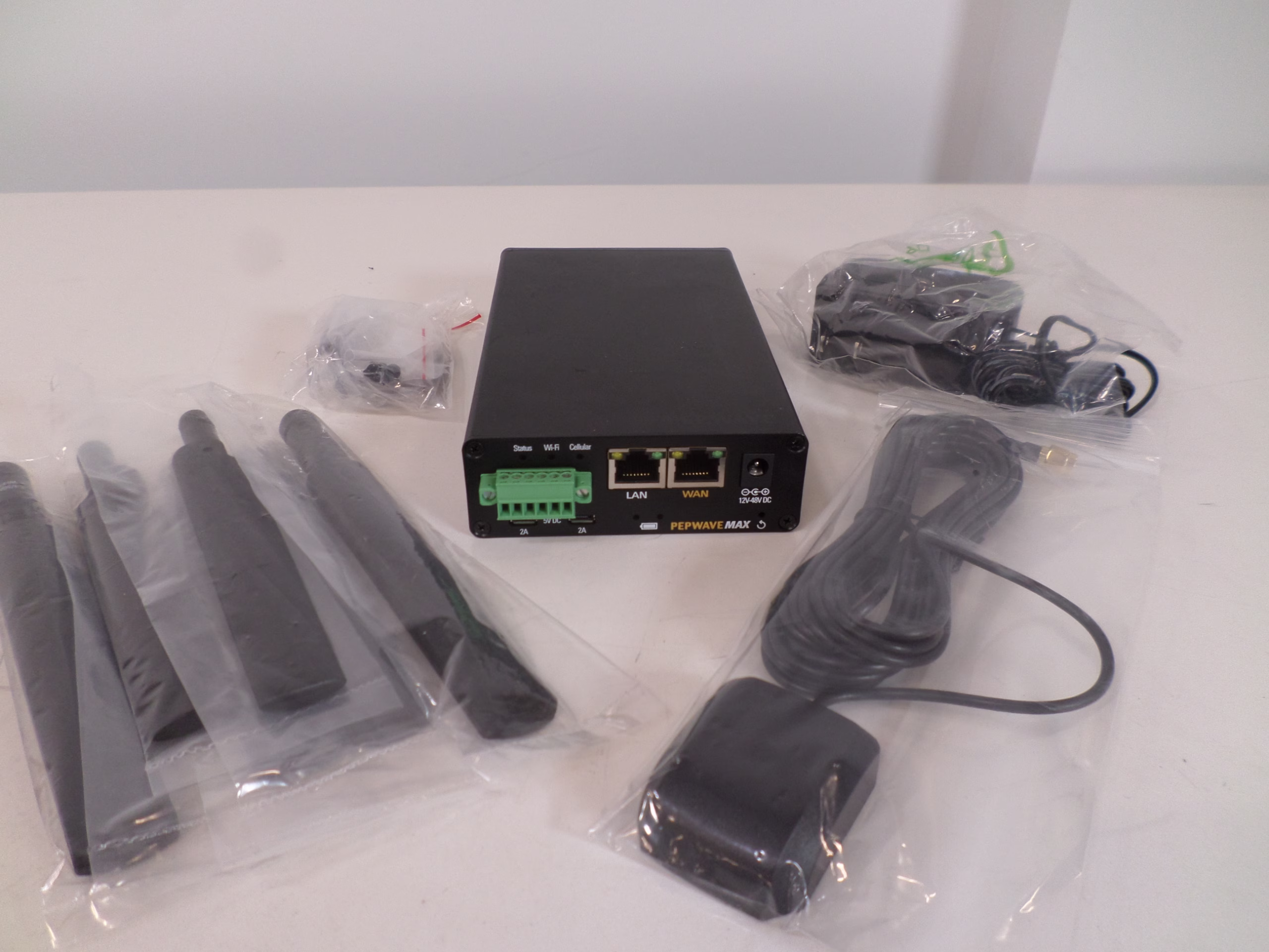 - Peplink Pepwave Router Model No. MAX-TST-GLTE-G-T-PRM S/N# 293A-4E87-DD75