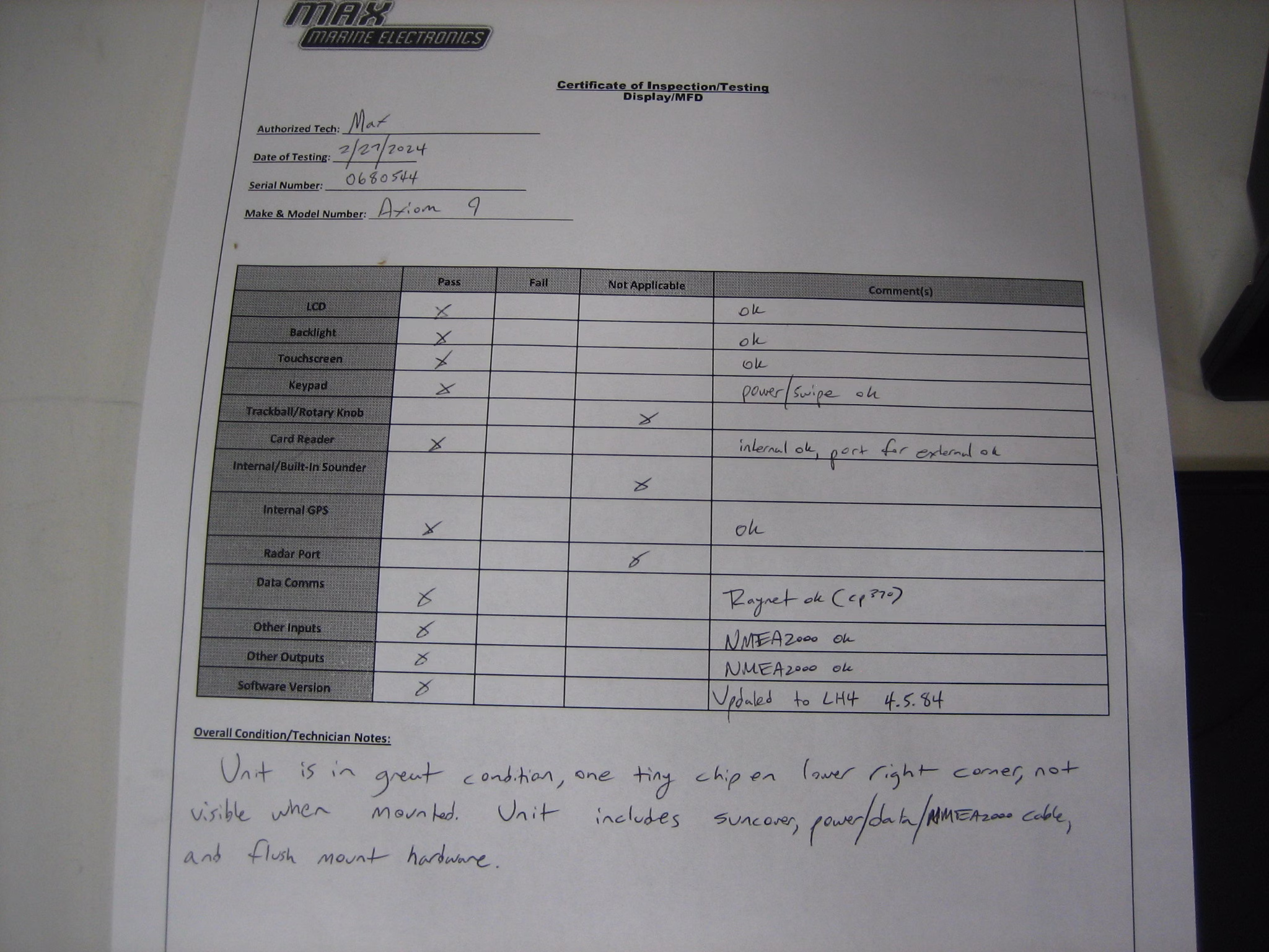 Additional Notes: This Axiom 9 is in good working condition. We have updated the software to Lighthouse 4, v4.5.84. The unit has been fully tested (see test sheet) and found to be fully functional. Card reader, NMEA2000, Raynet, internal GPS, and external card reader port all test ok. Touch screen, power/swipe button, LCD, and backlighting are all a 10 out of 10.