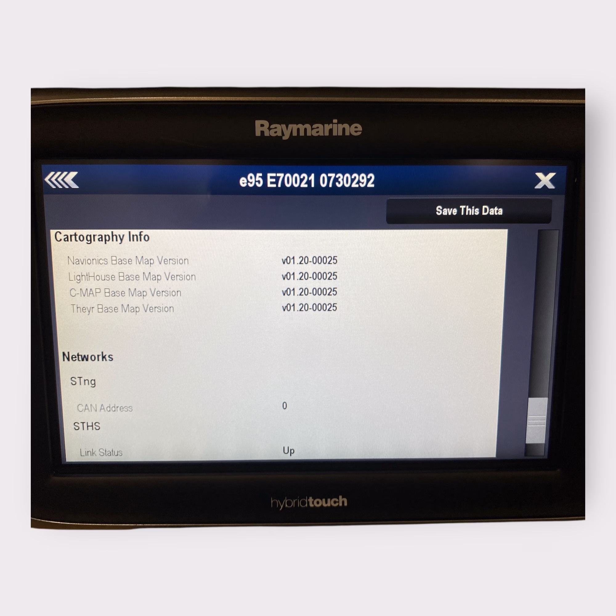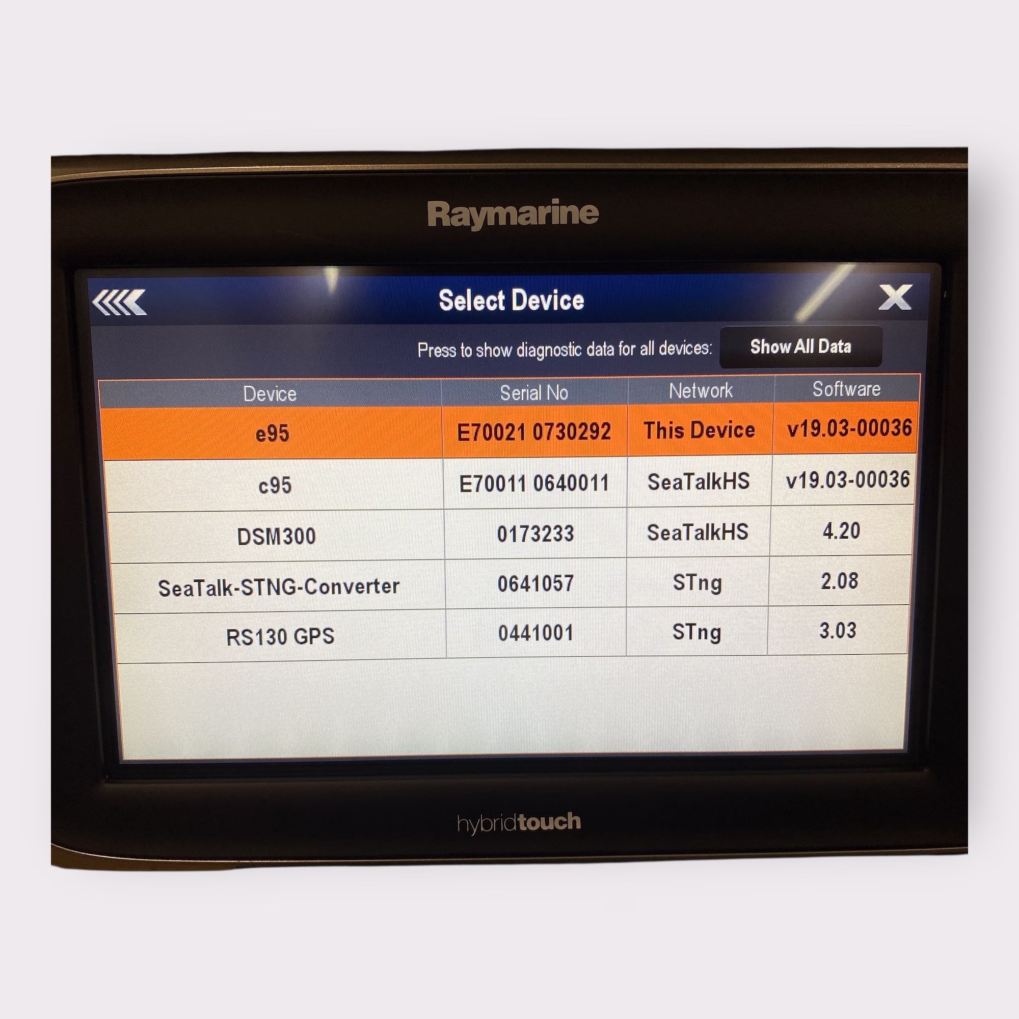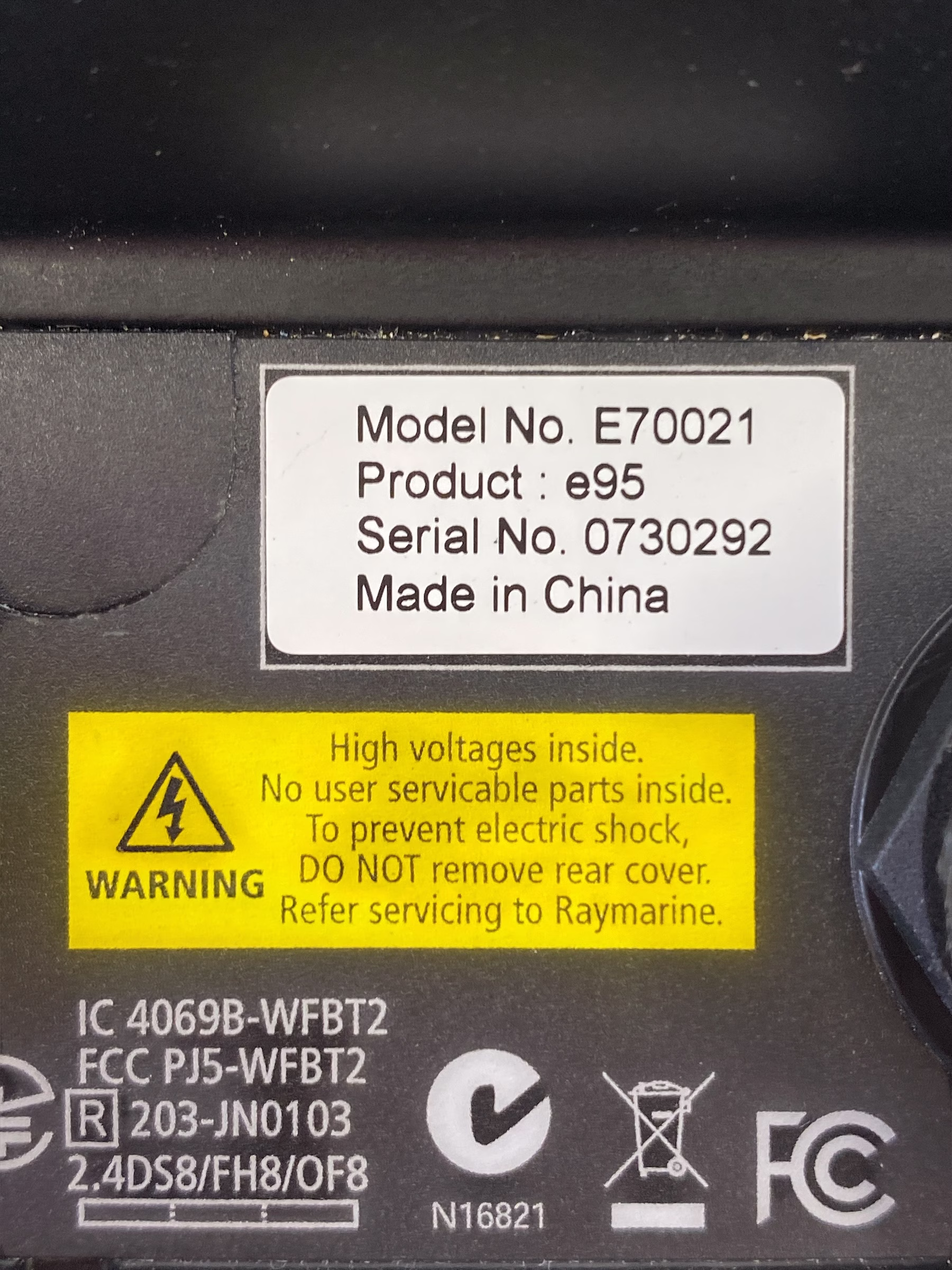 - Raymarine e95 HybridTouch Display S/N: 0730292