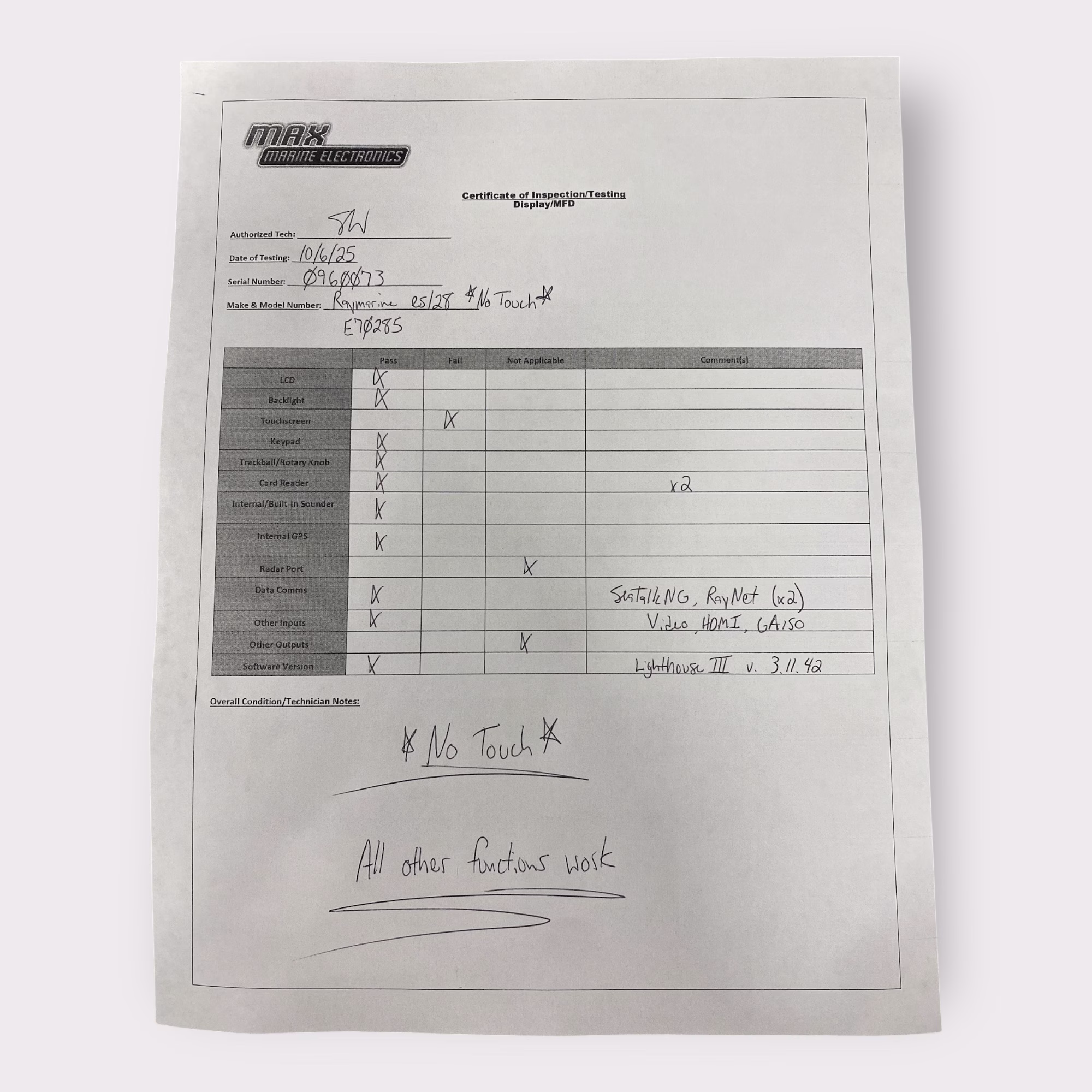 We have tested all functions of this unit, including the Internal GPS, Internal Sonar/Transducer port, Video, SeaTalkNG port, RayNet ports, card reader slots (chart cards NOT included), etc. All ports are intact and have no corrosion.