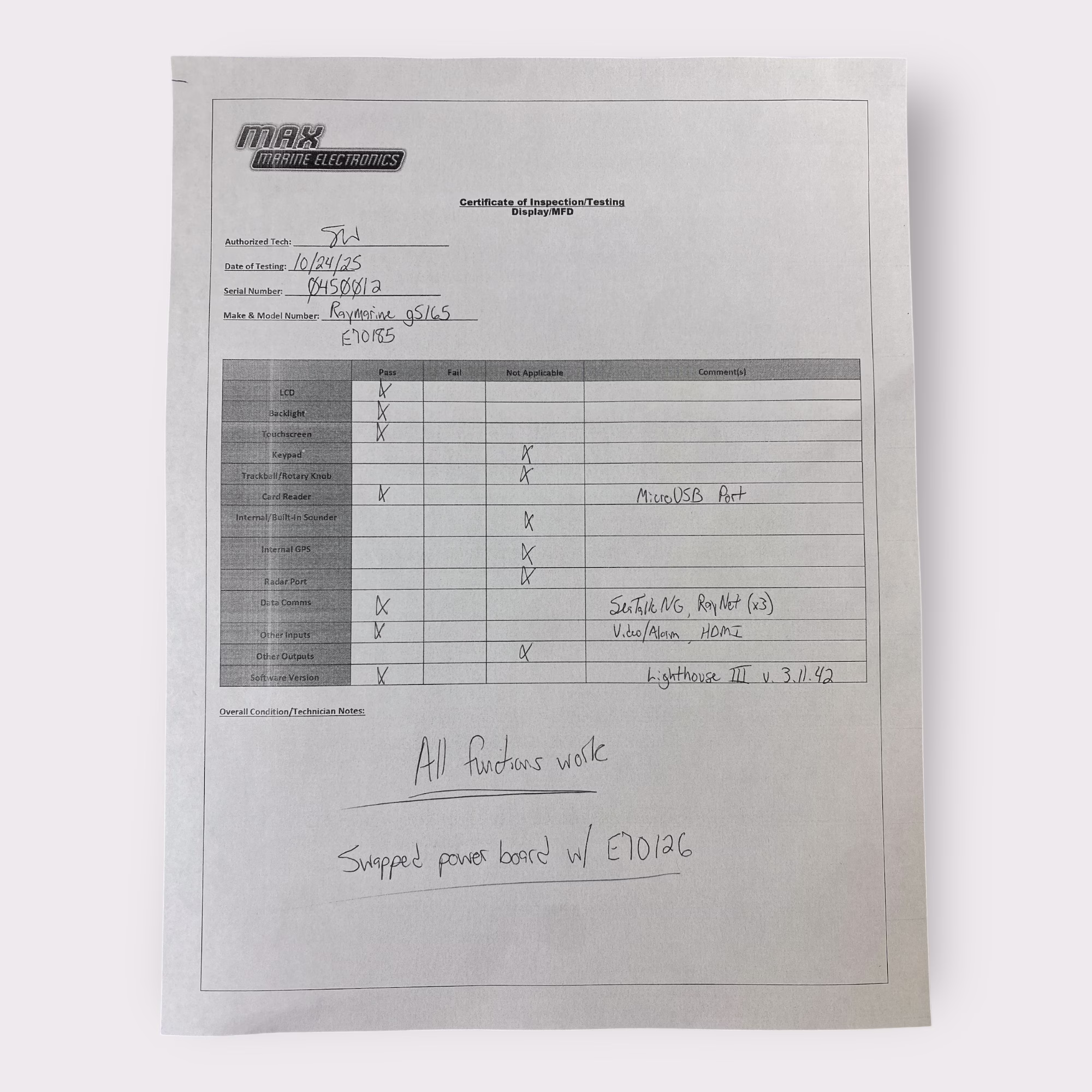 This display has been fitted with an E70126 (gS165 Non-Inverted) power board, because of a failing E70185 (gS165 Inverted) power board. This change does not impact the operation or quality of the gS165 — all functions run smoothly and just as designed.