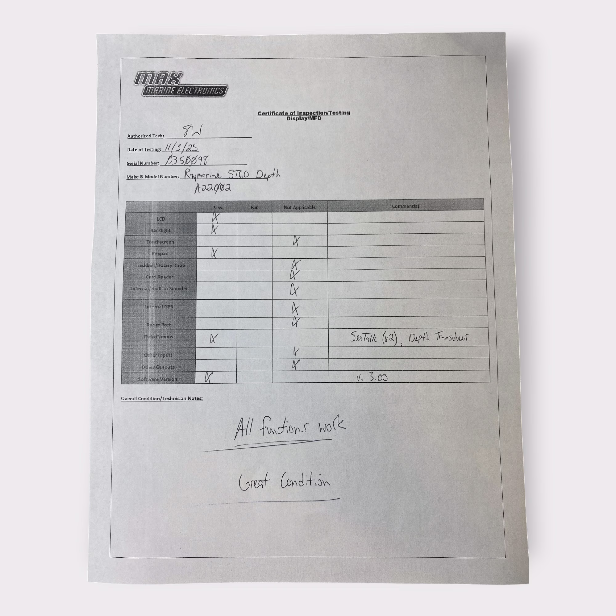 Both SeaTalk ports function correctly and the current software is version 3.00.