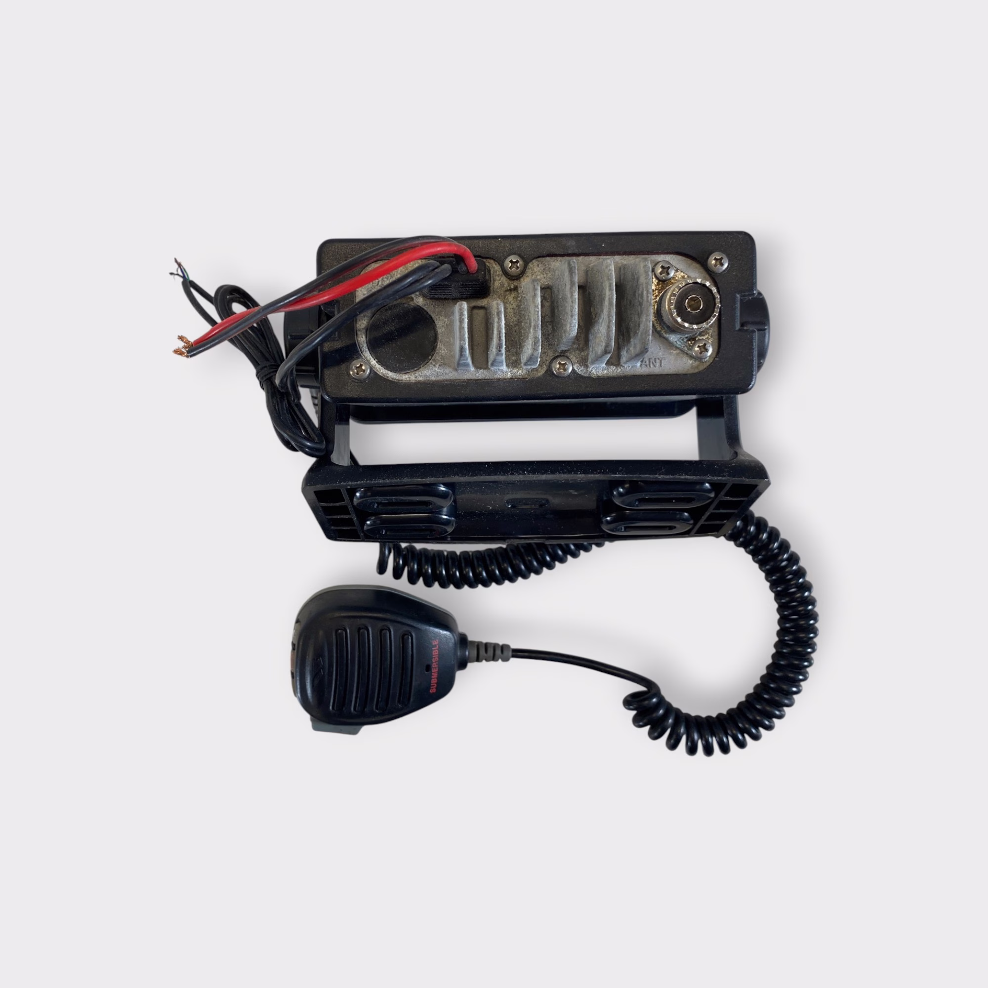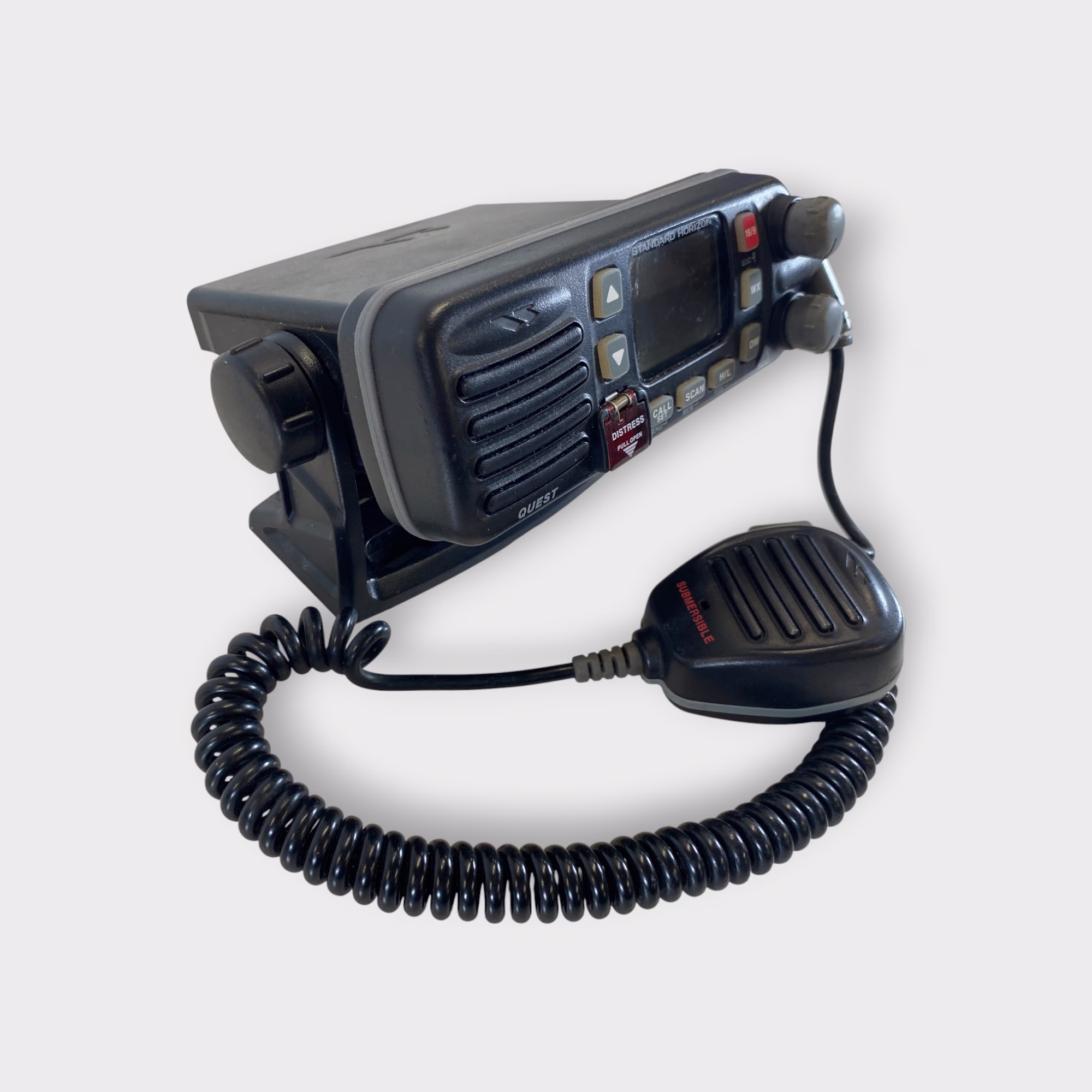 Additional Notes: This Standard Horizon Quest GX1255S VHF radio includes a fist mic and adjustable mounting bracket.
