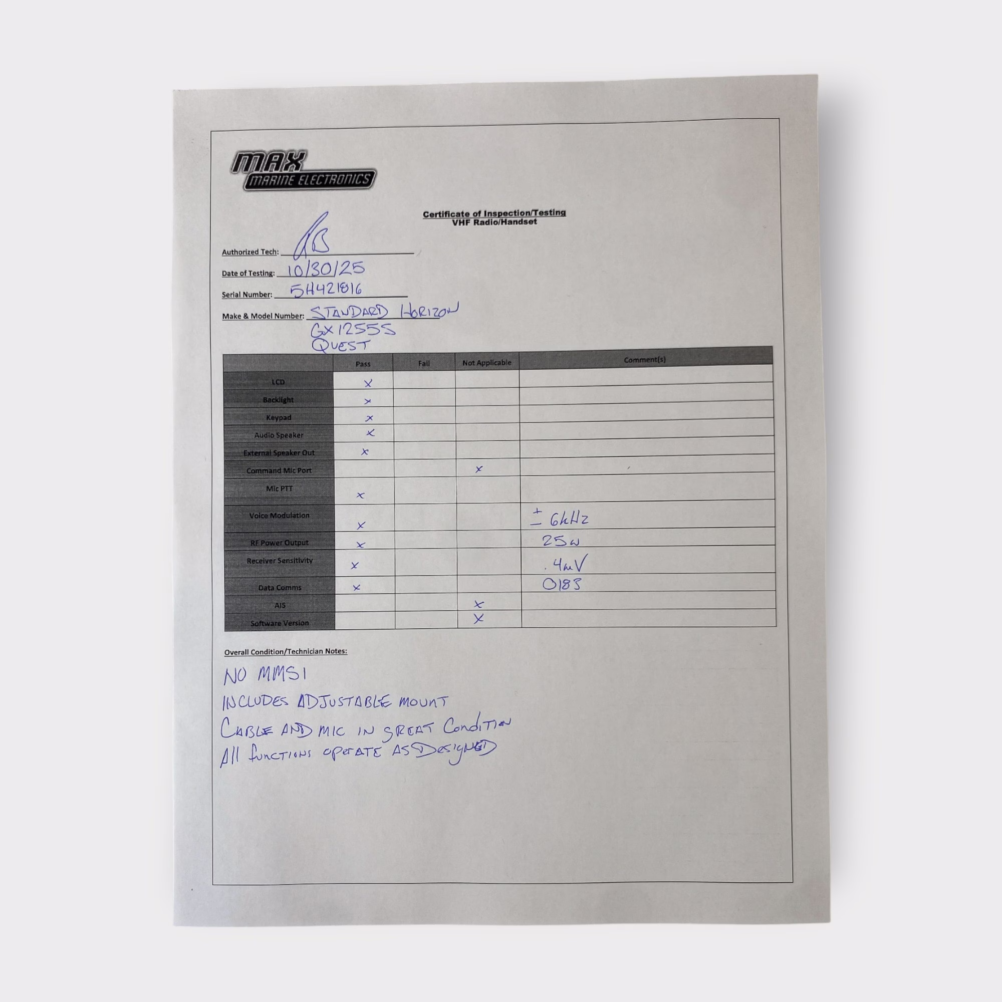 The unit was fully tested, including the NMEA 0183 connection and all other functions. Testing revealed great transmitter power and receiver sensitivity.