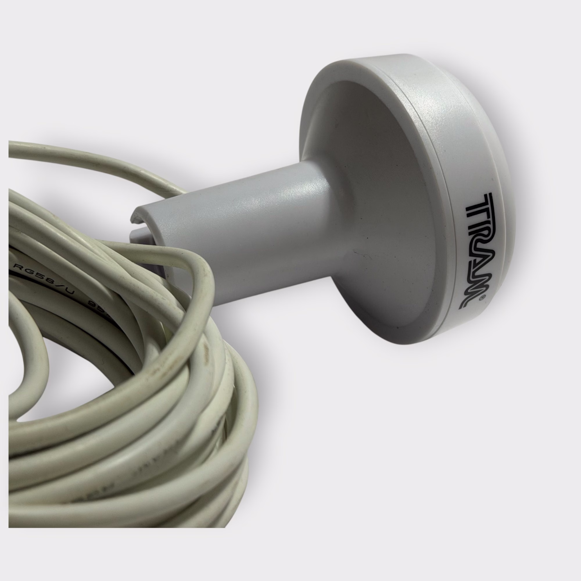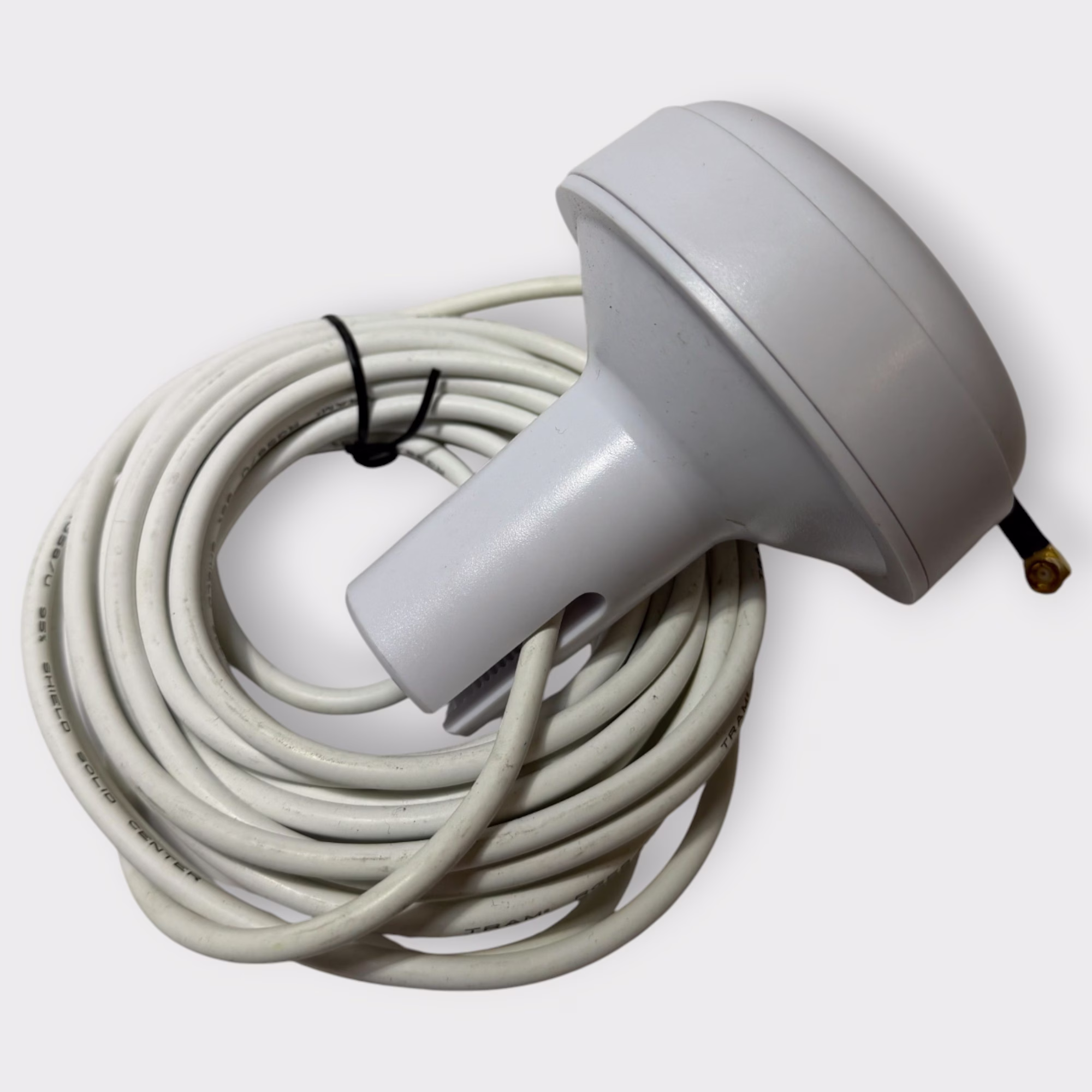Additional Notes: This is a Tram 1659-HC Antenna Only w/23′ of Attached Cable and Right Angle SMB Male Plug. Has an integrated 1″-14 threaded pole mount base for mounting to standard marine antenna mounts (such as ratched mounts, rail mounts, flange mounts, etc).